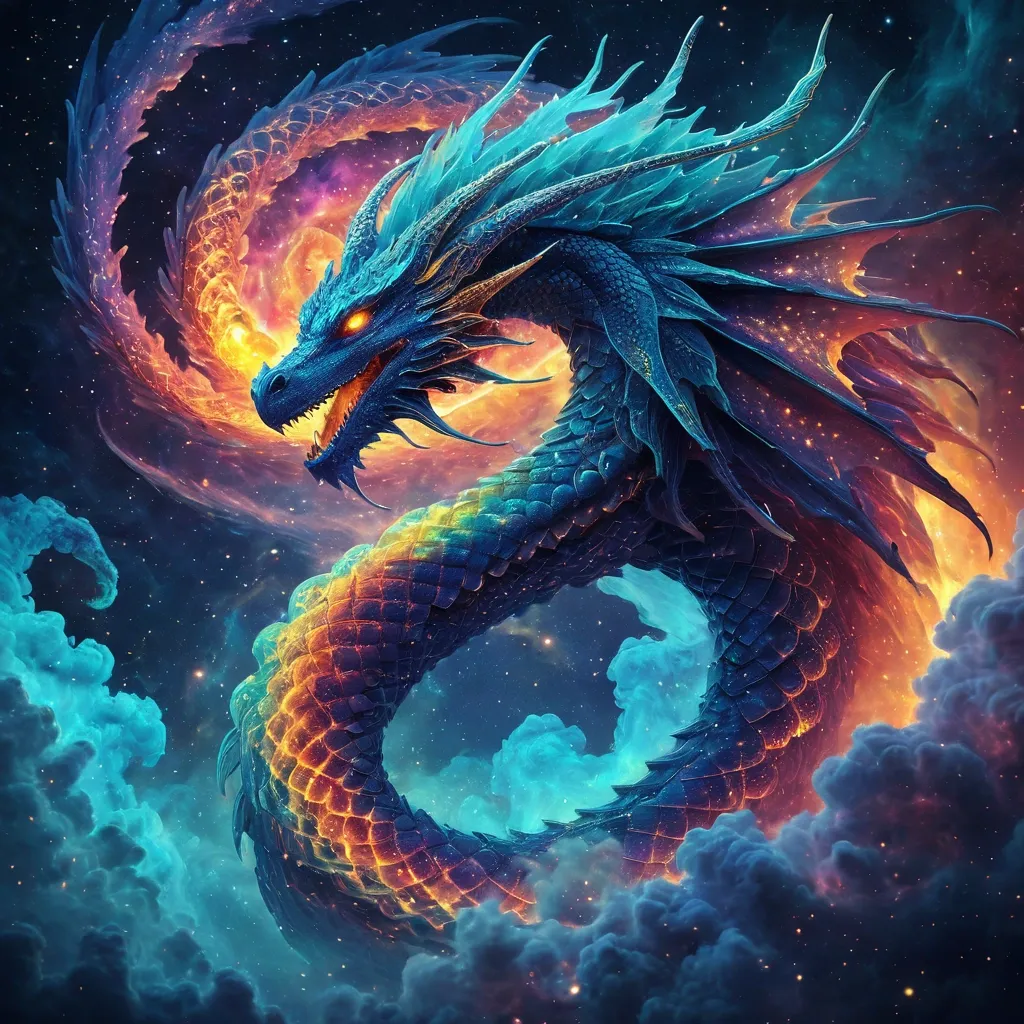 A majestic , bioluminescent dragon soaring through a vibrant , swirling nebula that mimics the patterns of ancient Babylonian ziggurats. The dragon's scales shimmer with cosmic energy , and its eyes glow with celestial fire. The scene is rendered in a breathtaking digital art style , with a focus on ethereal lighting and intricate details , inspired by the fantasy art of James Gurney and the cosmic scale of Carl Sagan's 'Cosmos'. ,