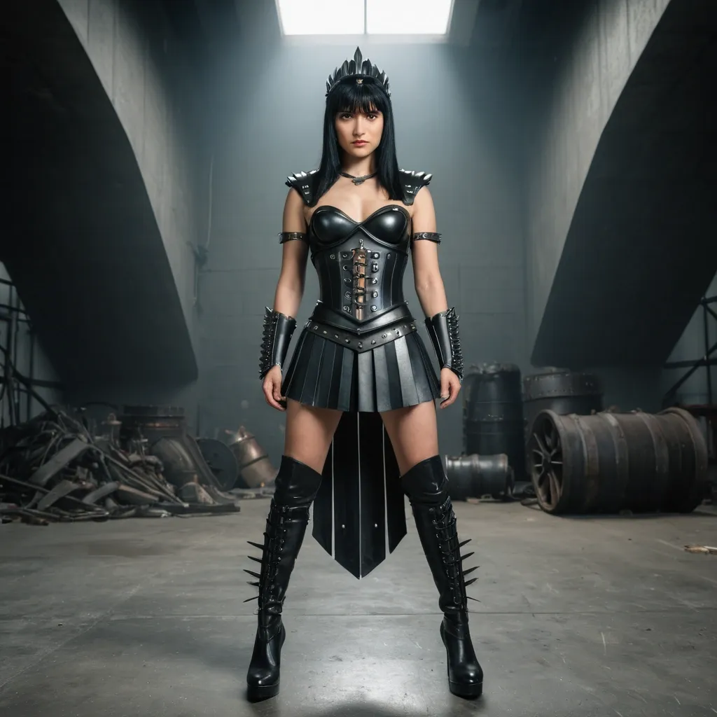 Masterpiece photorealistic full-length , a beautiful european pale 30yo wavy shoulder brown hair woman wearing a space spandex zipper suit black and purple , matching boots is standing next to a space starfighter in a futuristic space station hangar bay she's looking forward with an attitude of defy. Cinematic style ,