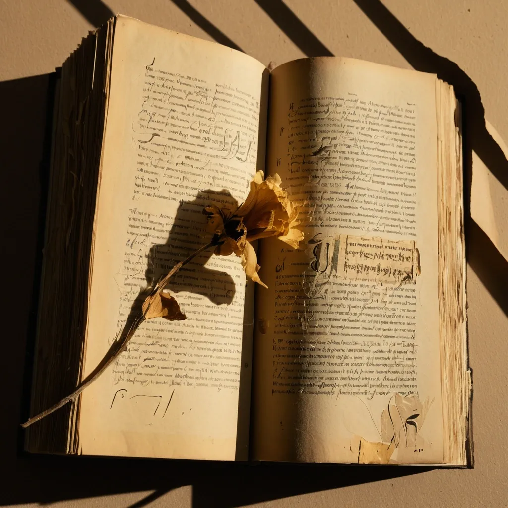 Cover of the song. A close-up of an old , open book. Between the yellowed pages lies a dried flower , almost crumbling. Soft sidelight creates long shadows. "n:athan" is faintly written on one of the pages. Colors: #8B5A2B , #F5E6D3 , #B0BEC5. Key images: Book , dried flower , shadows , paper texture. ,