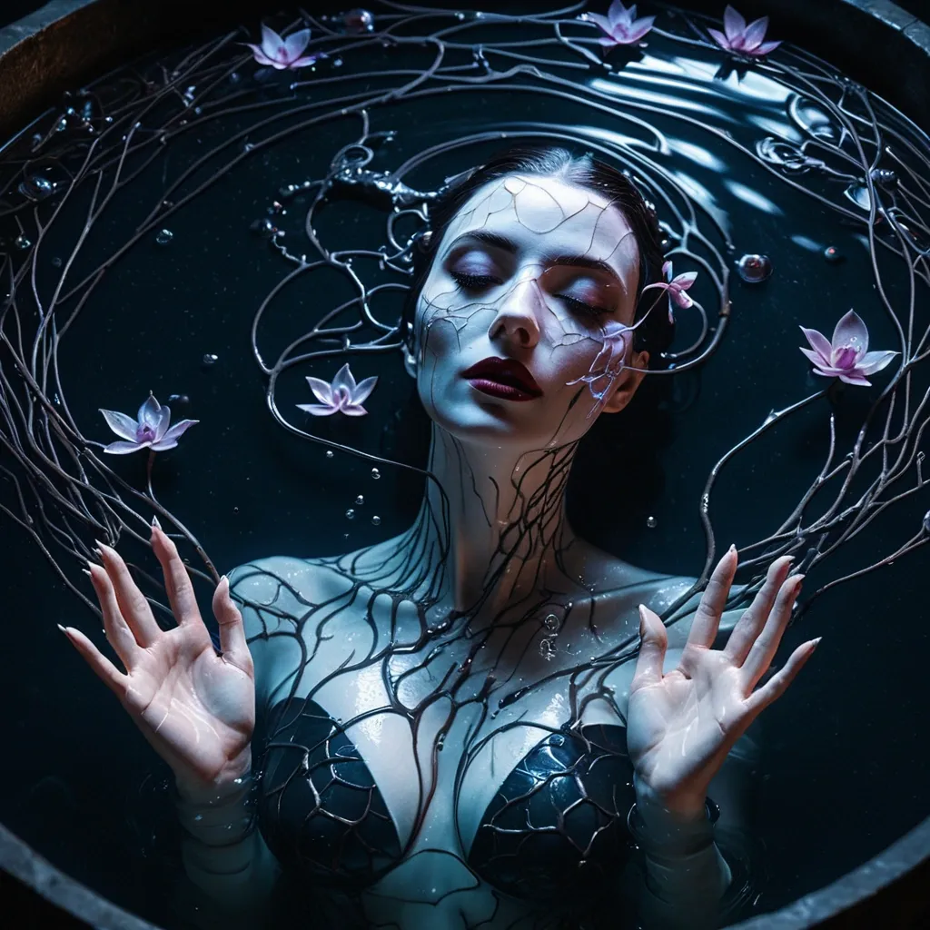 A hauntingly beautiful close-up photograph of a woman submerged in obsidian water , her porcelain skin veiled by a delicate lattice of ivy vines and floating gardenia petals. One elegant hand breaches the surface , fingertips tenderly suspending a single Japanese maple leaf over the tub's weathered edge , its crimson veins backlit by an eerie neon-blue glow that fractures like shattered cobalt glass across the water's surface. The ethereal illumination casts duotone shadows of lavender and pearl that ripple across her half-submerged face , catching on the dewdrops clinging to her parted lips and the tiny oxygen bubbles nesting in her eyelashes like liquid constellations. Beneath the surface , her hair drifts in weightless arabesques , strands catching the ambient glow like copper filaments in oil , while submerged magnolia blossoms slowly unfurl in the darkness. The extreme shallow focus (f/0.95) renders the antique clawfoot tub's details into impressionistic orbs of emerald and mercury , the bokeh distorting like stained glass underwater. Cinematic chiaroscuro lighting reveals microscopic textures—the leaf's translucent capillaries , the water's meniscus trembling at her collarbone , the way the neon refraction warps her fingertips into fleeting violet specters. A contemporary Ophelia suspended between drowning and epiphany , bathed in the electric hum of a bioluminescent moon , her surrender to the water captured in the moment it becomes impossible to tell if the vines are embracing her or dragging her under. The composition thrums with quiet metamorphosis—petals becoming scales , breath becoming bubbles , light becoming liquid. Shot on large format film with a vintage 58mm lens to render every detail with haunting hyperrealism , this image exists in the liminal space where beauty and melancholy share the same bloodstream. ,