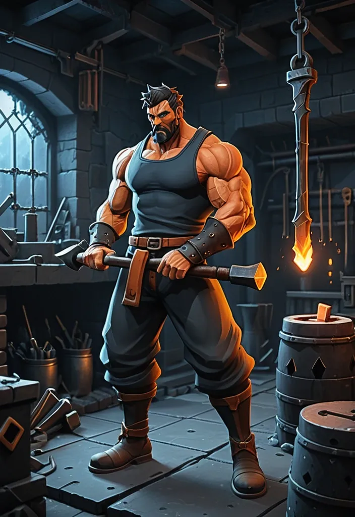 blurry , low quality , ugly , deformed , bad anatomy , extra fingers , photorealistic , hyperrealistic , anime , cartoon , modern objects , text , watermark , logo , oversaturated. Illustration is a night job. Blacksmith character , game character style , working at night , furnace glow illuminating face and hands , sweat on brow , intense focus , hammer and anvil , sparks , fantasy illustration , stylized realism , warm orange light on dark background. stylized realism , digital painting , high-fantasy mobile game art , dark palette with warm orange and gold accents , no text , no watermark , premium 2D illustration ,