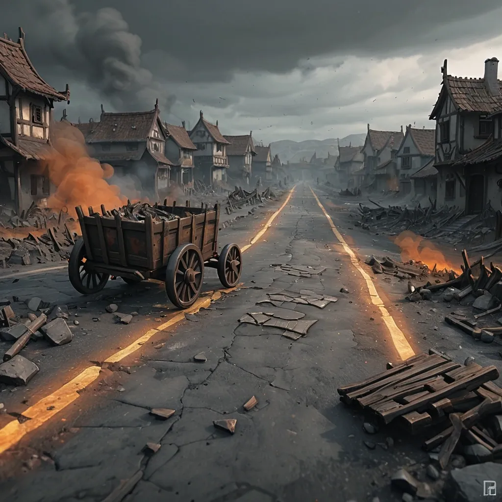 blurry , low quality , ugly , deformed , bad anatomy , extra fingers , photorealistic , hyperrealistic , anime , cartoon , modern objects , text , watermark , logo , oversaturated Illustration - destroyed road. War-torn medieval road , broken wooden carts , ashes and debris , desolate landscape , grey and brown tones , distant smoke , fantasy art , digital painting , stylized realism , moody atmosphere , no characters. stylized realism , digital painting , high-fantasy mobile game art , dark palette with warm orange and gold accents , no text , no watermark , premium 2D illustration ,