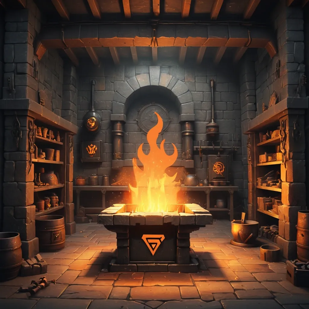 blurry , low quality , ugly , deformed , bad anatomy , extra fingers , photorealistic , hyperrealistic , anime , cartoon , modern objects , text , watermark , logo , oversaturated Background for the logo and loading bar. Portrait 9:16. Dark medieval forge interior , stone walls and wooden beams , large stone furnace with bright orange and yellow fire glowing inside , sparks flying from anvil in center , hot metal workpiece on anvil , smoke and ember particles rising , metal tools on shelves , soot-stained stone , wooden floor , dramatic lighting from furnace only , no natural light , atmospheric , moody , warm orange and amber highlights on dark grey and brown , stylized fantasy art , digital painting , mobile game background , vertical composition 9:16 , empty center area for logo overlay , no characters , no people , 1080×1920 , portrait. bright , daylight , sunny , characters , people , text , cluttered center , logo. stylized realism , digital painting , high-fantasy mobile game art , dark palette with warm orange and gold accents , no text , no watermark , premium 2D illustration ,