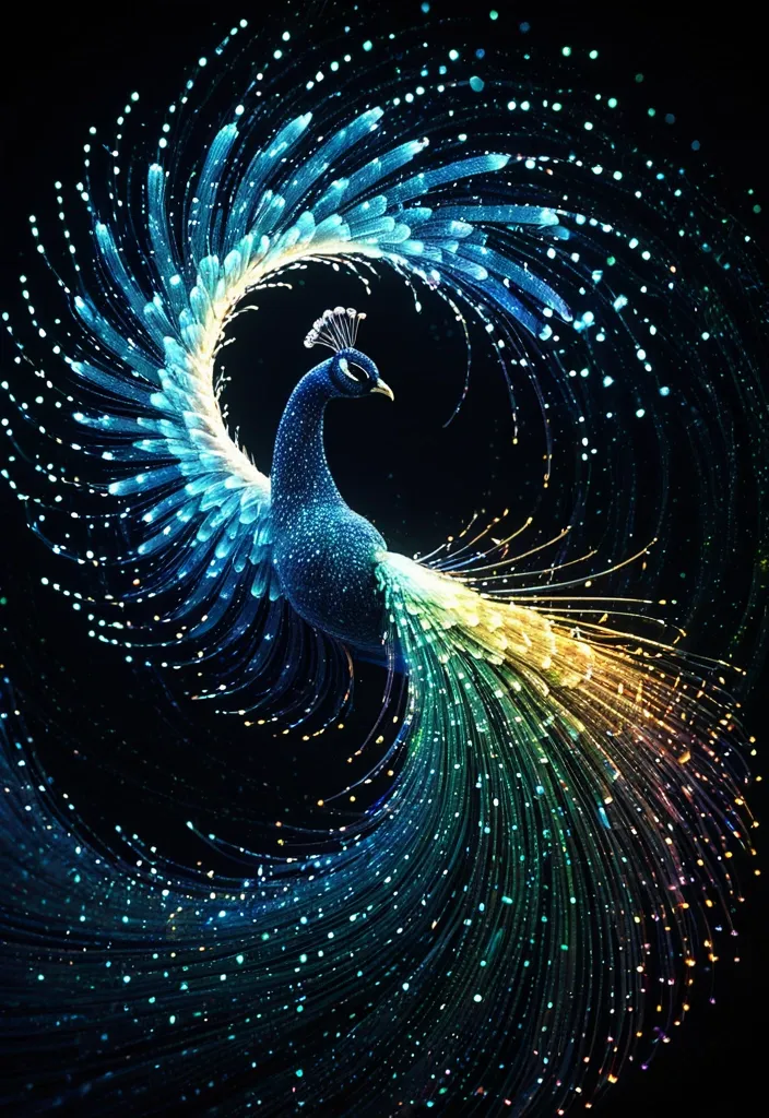 An aerial perspective looking down at a peacock in dynamic motion , rendered entirely as a luminous pointillism feathers made of thousands of glowing , translucent stripes and beads in a vibrant gradient. The feathers flows into a dramatic vortex that forms on large tree , half-vortex at garden. Style: Celestial , ethereal , abstract , digital art black Lighting: Dramatic backlighting , bright glowing particles , contrasting dark background Composition: dynamic diagonal , composition , upward gaze Details: Sparkling waves and smoke , streaking white light trails , sense of movement and wonder , magical atmosphere Quality: High detail , 4K , Masterpiece , Rendered in Octane. ,