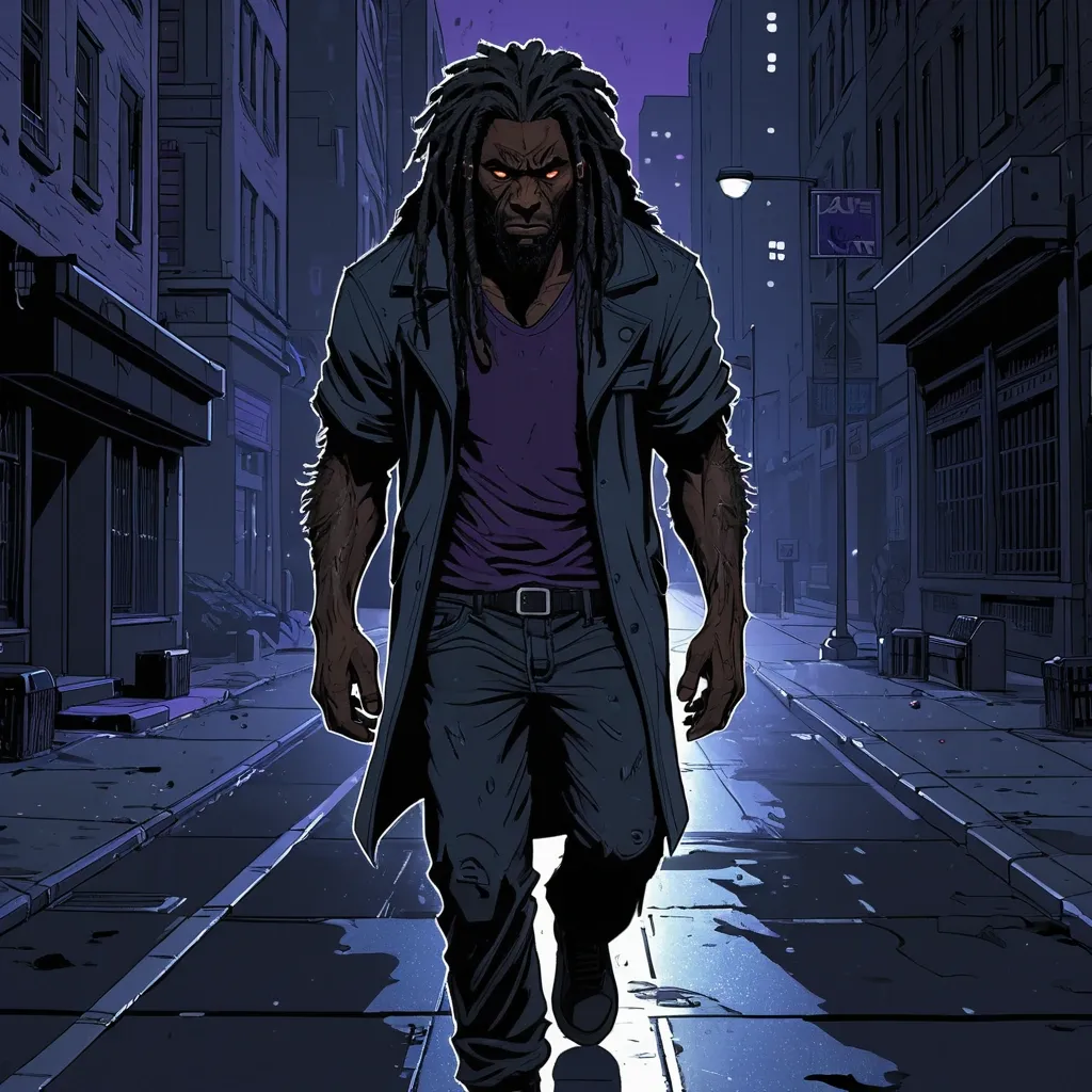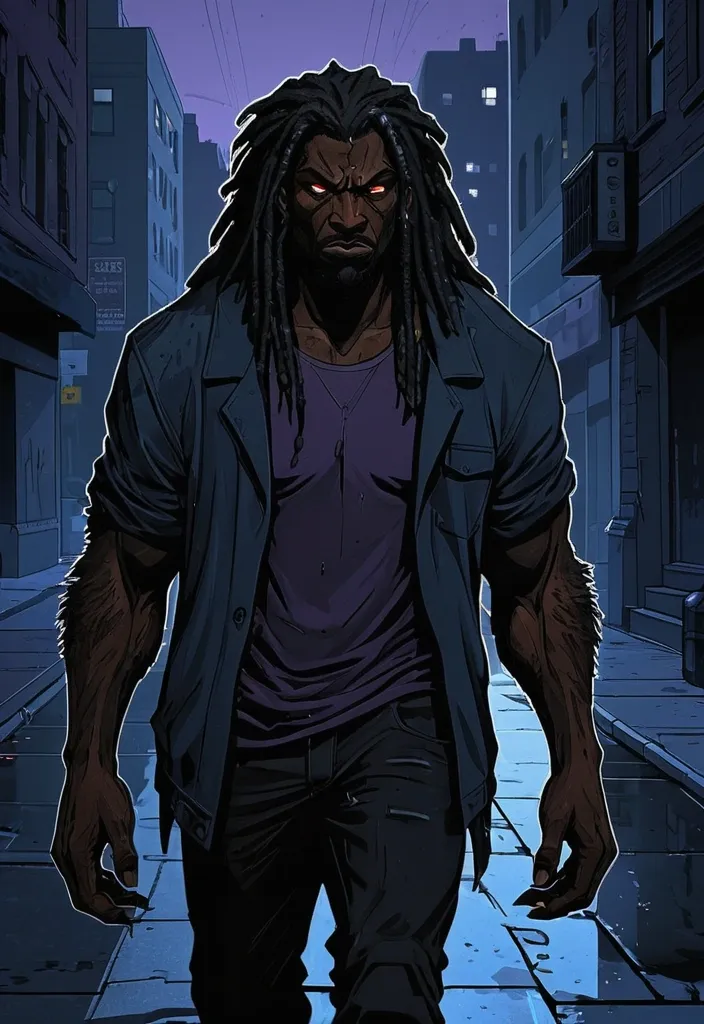 A strong , imposing werewolf with dark skin , dreadlocks , and wolf-like eyes walks alone through the city streets , utterly desolate. This illustration is rendered in a graphic novel style , with bold lines and dramatic shadows , reminiscent of Artstation illustrations. He does not cry , but the profound sense of loss is evident in his eyes. His expression is perpetually serious , devoid of any joy or spark. The city lights reflect off the wet pavement , accentuating his solitude. The overall color palette is muted and somber , with deep blues , purples , and blacks dominating , emphasizing his despair and the weight of his grief. ,