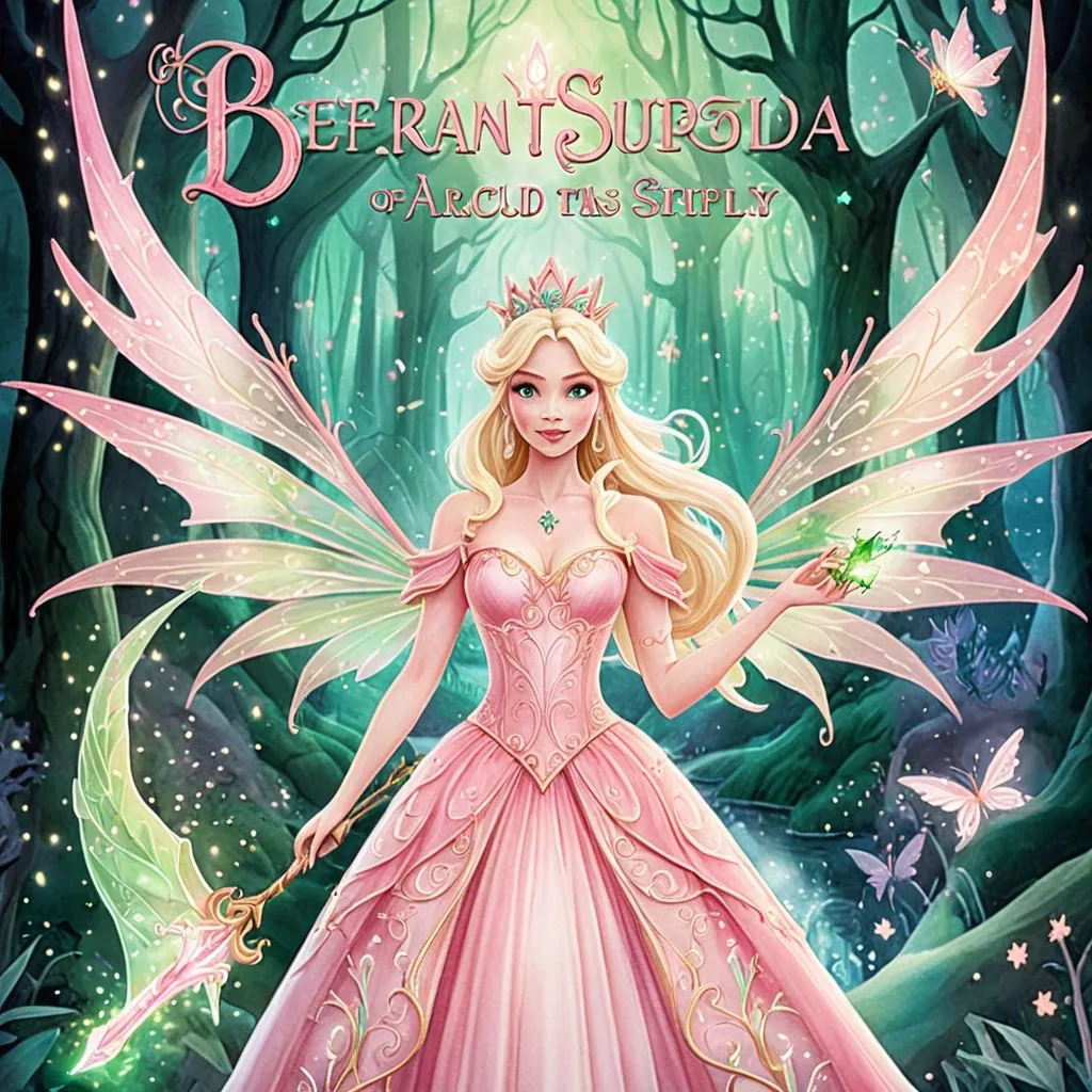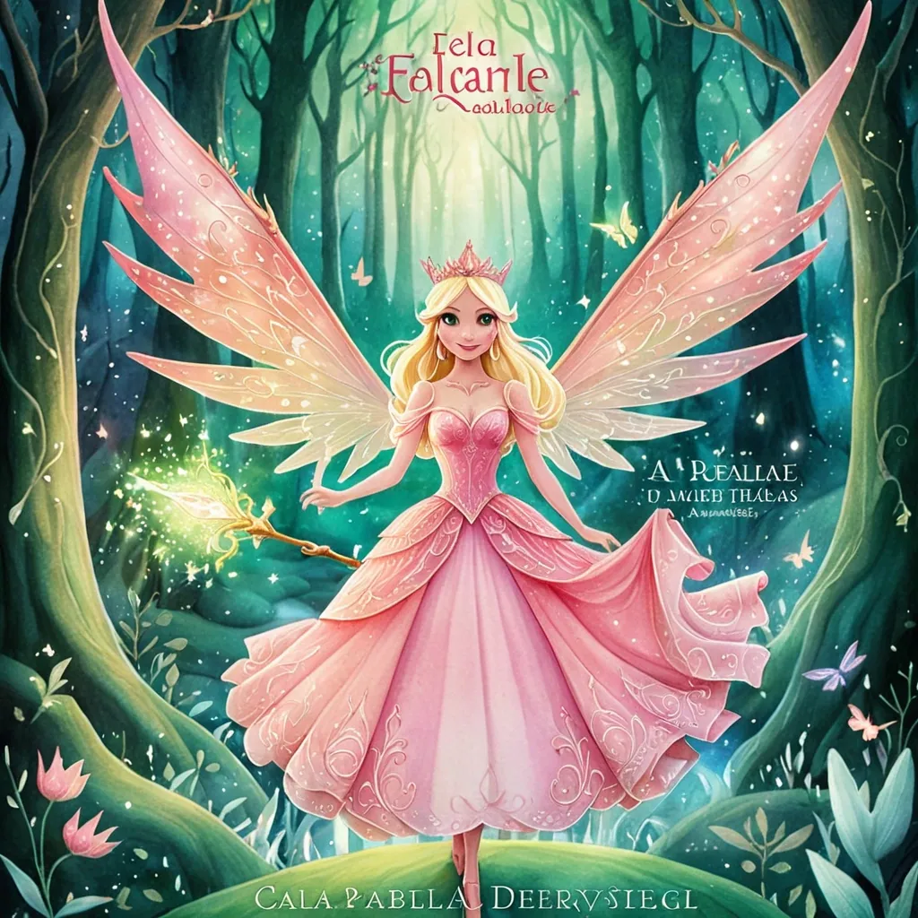 Portada de cuento infantil titulada “El Bosque de los Sueños Brillantes”. Ilustración de fantasía , estilo acuarela brillante , colores pastel , bosque mágico con luces , princesa rubia con vestido rosado sosteniendo una varita , un hada con alas y un dragón verde al fondo. Letras grandes y elegantes con el título en la parte superior. ,