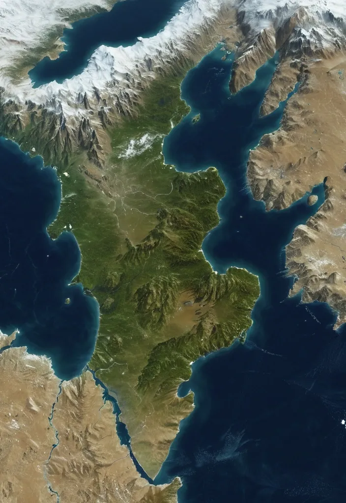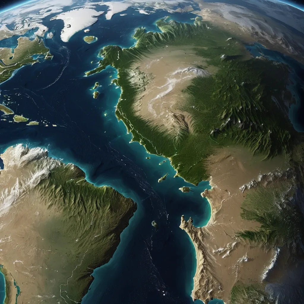 A completely original fantasy world map , seen from space , with three large main continents of different shapes and sizes , separated by vast oceans. The continents should have realistic topography — mountains , valleys , deserts , forests , rivers , and islands — visible from above like a real satellite image. The coastlines must be natural and complex , not resembling Earth’s continents. The style should be highly detailed , photorealistic , satellite-view style , showing terrain colors (green for forests , brown for mountains , beige for deserts , white for snow , deep blue for oceans). Lighting from the sun , atmospheric haze around the planet , high resolution. No text labels , no borders , no countries , no names , no clouds obscuring the surface. An entirely new , unique planet.Add subtle curvature of the planet , realistic water reflections , and cloud layers at the edges only. The planet should look Earth-like in physics but with an entirely different geography. ,