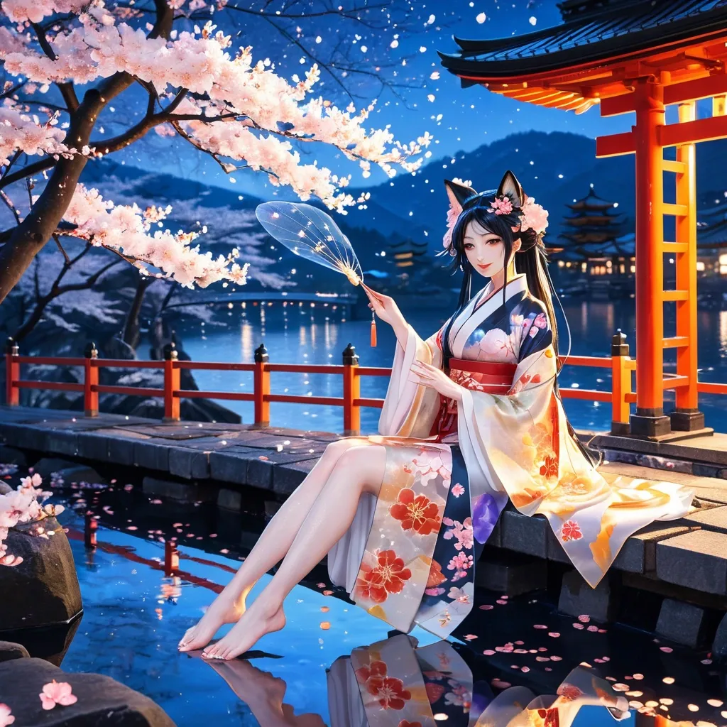 A charming chibi kitsune girl in an elaborate floral kimono , appearing as a crystalline skin , rainbow colors and flowers , sitting gracefully on the edge of a vermillion torii gate bridge. Her small fox ears peek through silky black hair adorned with cherry blossom pins , while she dangles her bare feet in the tranquil koi pond below , watching fish swim beneath the surface , Its skin glows in crystalline skin that refracts light into dazzling rainbow colors. Golden fireflies drift lazily around her petite form as she holds a delicate white paper umbrella , with soft pink cherry blossom petals cascading through the twilight air. The scene is bathed in deep blue ambient light punctuated by the warm yellow glow of traditional stone lanterns , creating perfect reflections in the still water that mirror both the torii gate and the magical atmosphere above. ,