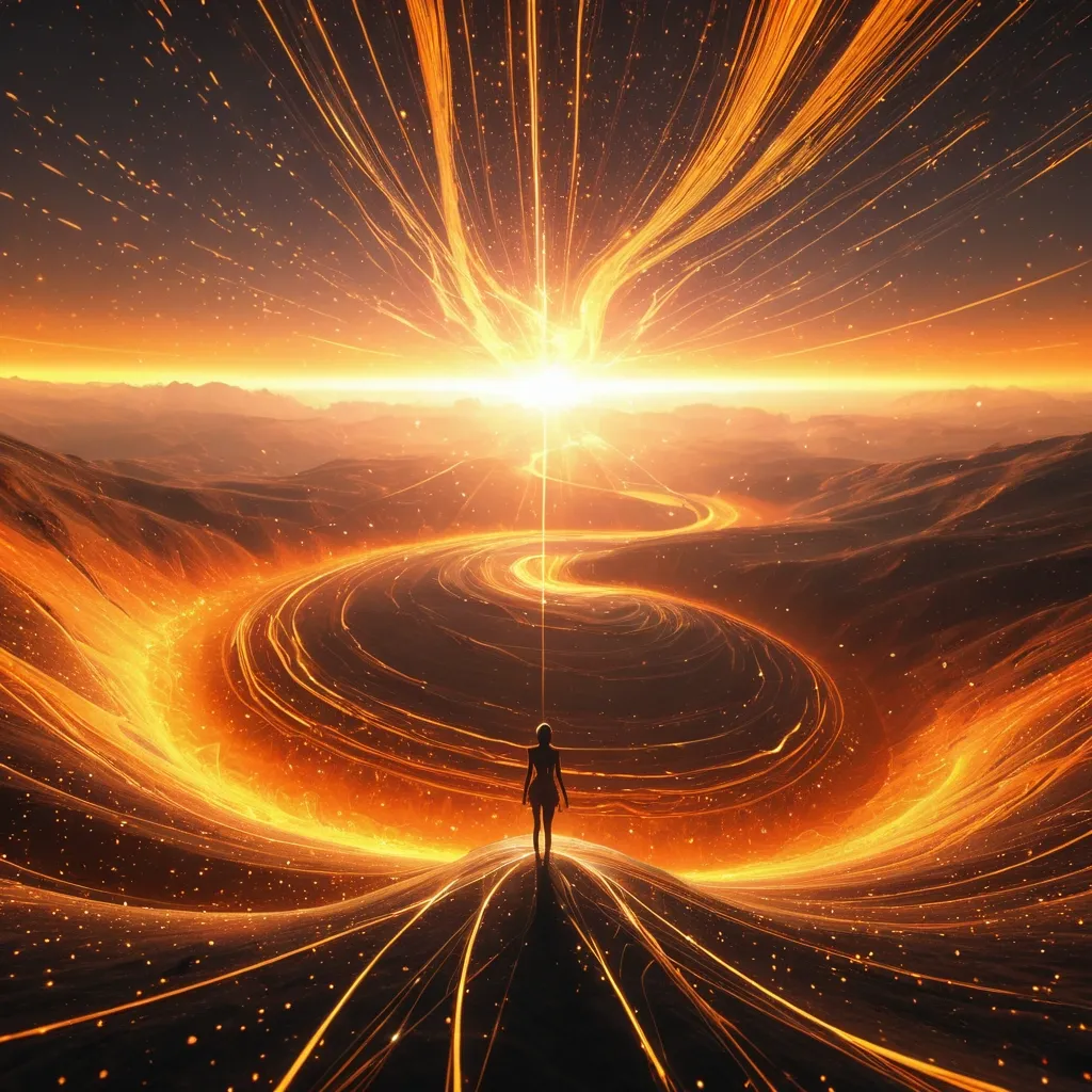 Ethereal Golden Hour: A high-angle bird's-eye view , landscape Moment Melting from a vortex sunrise rendered as a Fractal ray , abstract digital art depicting A lone woman stands on , gazing at a golden hour sunrise that paints the sky in hues of orange , pink and gold , shrouded in orange and yellow tulle-like dots , set against a low-resolution metallic black background with subtle white accents. The minimalist , naturalistic landscape features a dynamic diagonal composition with dramatic backlighting , bright glowing particles , and streaking white light trails , evoking a sense of movement , wonder , and magical atmosphere , rendered in high-detail 4K with Octane.Ethereal Golden Hour: A high-angle bird's-eye view , landscape Moment Melting from a vortex sunrise rendered as a Fractal ray , abstract digital art depicting A lone woman stands on , gazing at a golden hour sunrise that paints the sky in hues of orange , pink and gold , shrouded in orange and yellow tulle-like dots , set against a low-resolution metallic black background with subtle white accents. The minimalist , naturalistic landscape features a dynamic diagonal composition with dramatic backlighting , bright glowing particles , and streaking white light trails , evoking a sense of movement , wonder , and magical atmosphere , rendered in high-detail 4K with Octane. ,