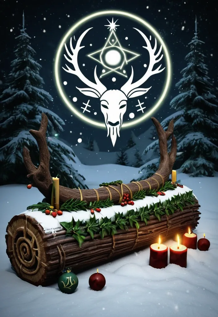 Generate a statement makeup on a very pale white skinned female model with fiery red hair. The white skin has a metallic light blue shimmer. The lipstick is metallic ombre magenta and red. The eyebrows are very light platinum blond. The eyeshadow is a matte forest green hooded eye makeup. The model has amber hooded eyes. The eyeliner is pine green , with double wings. The inner corner of the eyes are highlighted with frosty mint green eyeshadow. The model is wearing a linen cloth blouse with forest green and red cross-stitch embroidery patterns on it. In the background , there is an autumn forest with deep burgundy , mustard yellow , and orange leaf colors. ,