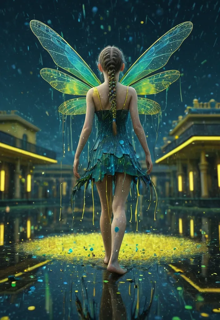 Creative dragonfly's wings resembling a rain-like in wallpaper , (3D rendering:1.1) Horizontal surreal composed of (blue , green and yellow particles fading into the dark sky:1.1) , with a smaller flow , lighter (blue and green particle formation behind it diminishing in size:1.0) , a beautiful 22-year-old European female pale skin shoulder elaborate brown braids in a torn and dirty cocktail dress , rendered in (dim-yellow dots reflecting on calm , reflective ground:1.2) , extending from the base of the structures into the foreground. (Surrealism:1.2) , digital art , (high detail:1.1) , (intricate textures:1.0) , photo-realistic , octane render , vivid colors , smooth reflections , award-winning art , concept art. ruined prom ballroom background. ,