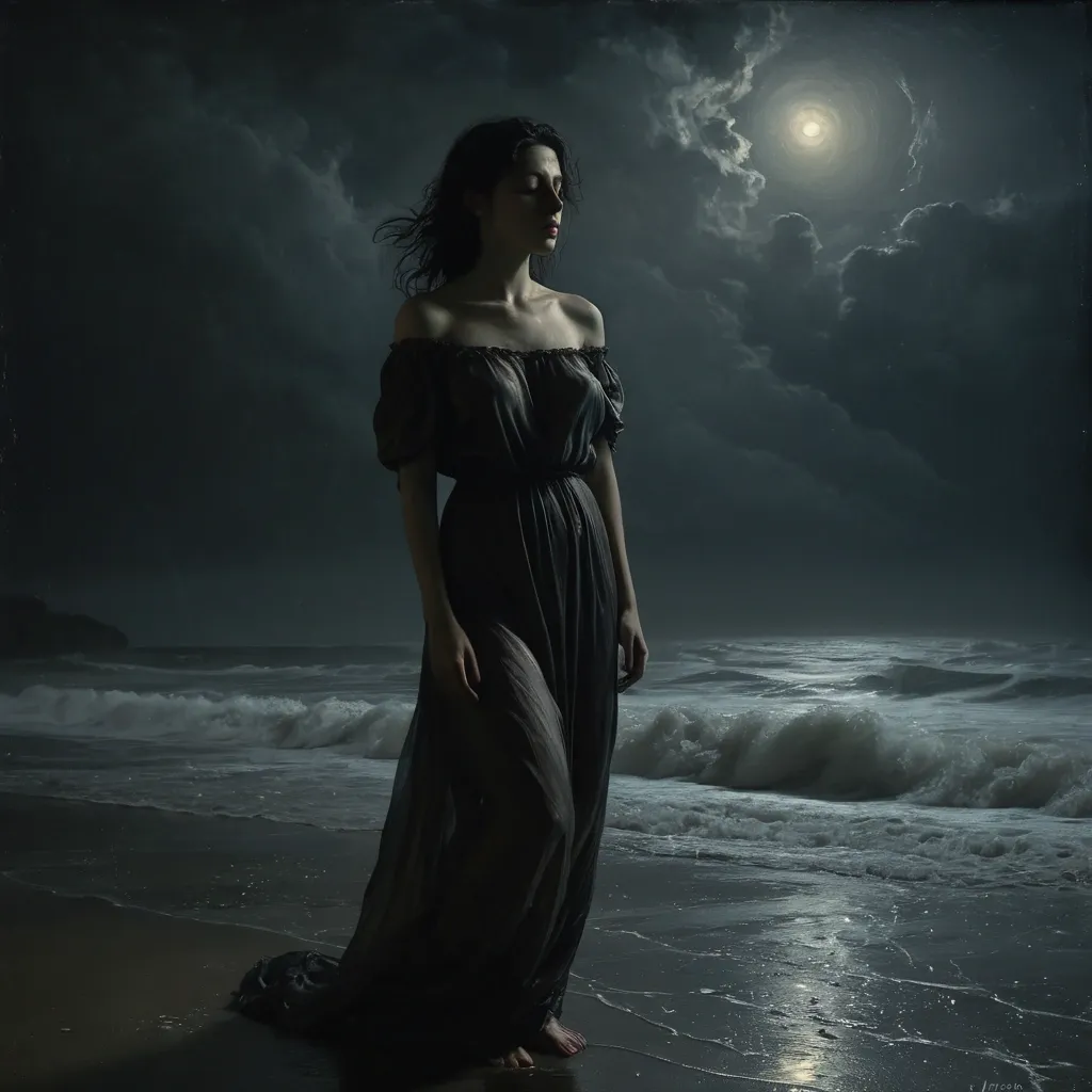 A melancholic woman with dishevelled dark hair and weary eyes , in a flowing , off-the-shoulder silk slip dress , stands on a desolate moonlit beach. The crashing waves reflect a deep , introspective mood. Wisps of fog curl around her. Above , a vast , star-filled sky suggests both unreachable dreams and existential loneliness. Her posture conveys a profound sense of longing and sadness. This is rendered in a moody , atmospheric oil painting style , with dramatic chiaroscuro lighting reminiscent of Caravaggio , and the ethereal , dreamlike qualities of Symbolist painters like Odilon Redon and Gustav Klimt , conveying a rich emotional narrative. ,