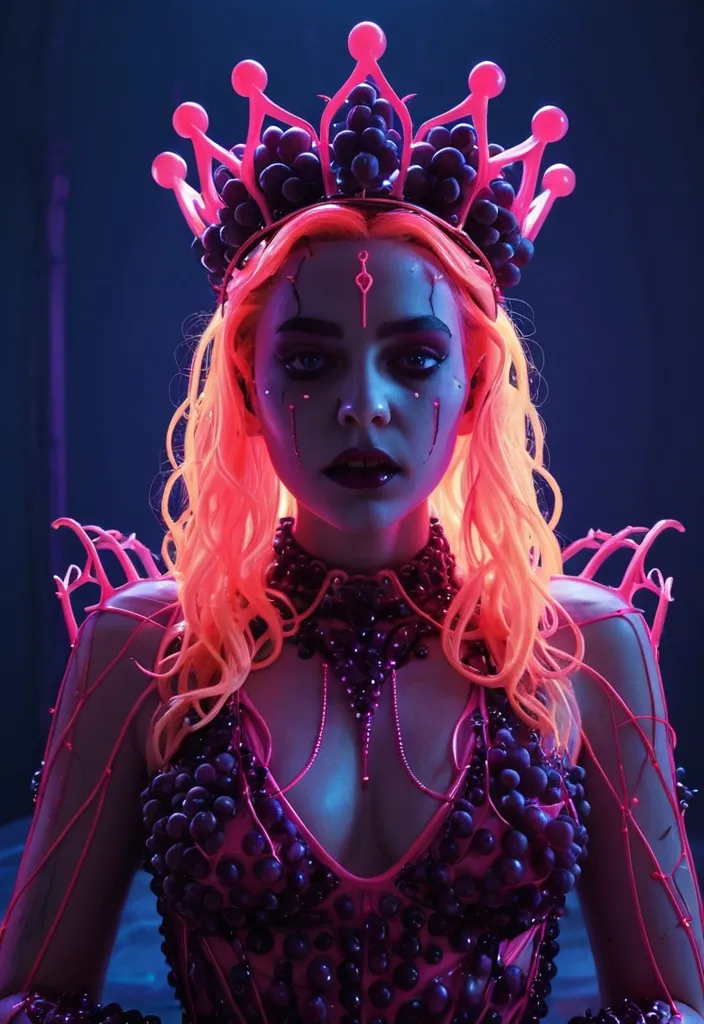 A highly-realistic , detailed , 4K photorealistic image of Heath Ledger and Margot Robbie’s interpretation of The Joker and Harley Quinn. An intensely passionate scene of the two locked in a chaotic loving embrace in a cosmic galaxy. They’re surrounded by swirling neon-green bioluminescent stars and ashimmering night sky galaxy , under an iridescent glowing moon , casting an ethereal light upon the couple. The image is full of raw passion. Neon , UV blacklight colors—electric pink , venomous green , and pulsating purple—light up their forms , with Joker’s scarred grin glowing , and Harley’s neon-sparkled pigtails shining. Magical fantasy style image with a psychedelic edge , blending fantasy and madness in a vibrant , high-contrast scene. ,