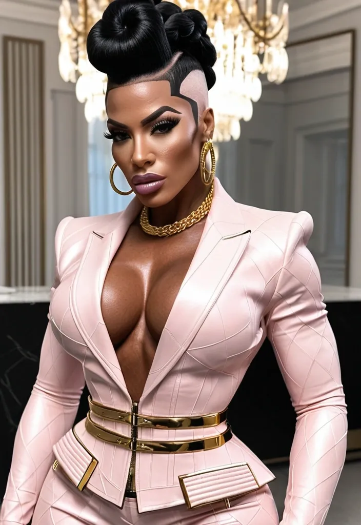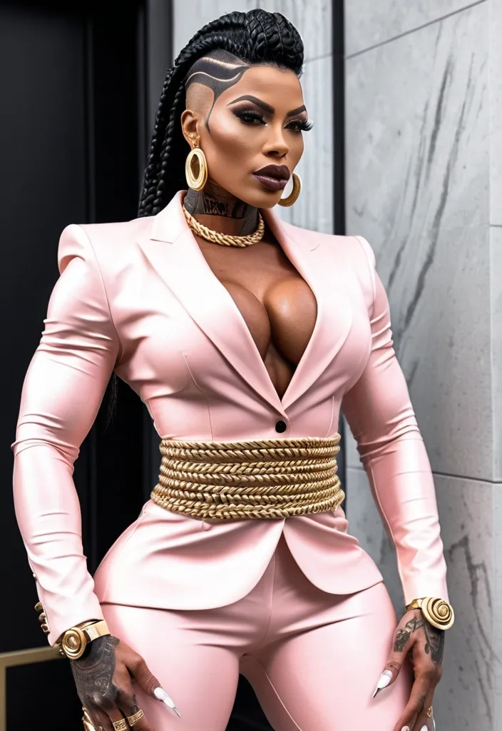 Generate a African-American woman , gorgeous female boss , bimbo , hourglass body , abnormally massive female bodybuilder , gorgeous , close up , full lips , big booty , black hair , braided mohawk designer style hair , bald on the side , feminine silhouette , too big breast , big booty , sexy thighs abs , silhouette , up close , flexing biceps , beautiful brown eyes , legs are iconic and defining physical feature , both visually and in terms of combat ability.wearing an outfit that is a striking blend of elegance , power , and femininity , designed to command attention in any room. The suit is tailored to perfection , hugging the wearer’s curves with precision while emphasizing a structured silhouette. The fabric itself is a refined pink tweed patterned with subtle white grid lines , giving the suit a texture that feels both sophisticated and modern. The blazer features broad white lapels and gold button accents , adding a luxurious touch that elevates the look beyond typical business attire. The matching high-waisted trousers elongate the frame , further enhancing the poised and commanding effect of the ensemble.The styling choices amplify the boldness of the suit. The inner blouse is a silky , blush-pink button-down shirt that complements the tweed’s tone while introducing a softer , feminine balance to the sharp tailoring of the jacket. The blouse peeks out neatly from under the blazer , maintaining elegance without drawing focus away from the suit’s commanding cut. Accessories are kept minimal yet intentional: a delicate layered gold necklace and hoop earrings that add glimmers of light and luxury without overpowering the outfit. The choice of voluminous , honey-brown braids cascading down her shoulders frames the face with both confidence and glamour , completing the commanding visual.Altogether , this look communicates a blend of authority and allure. It is business-ready yet fashion-forward , balancing corporate structure with vibrant femininity. The color palette of pink , white , and gold avoids being overly delicate , instead embracing the richness of texture , structure , and presence. This is the kind of ensemble that speaks to ambition , sophistication , and personal style—ideal for someone who thrives in positions of influence but insists on expressing her individuality with bold elegance. It’s not just clothing—it’s a statement of power wrapped in grace. ,