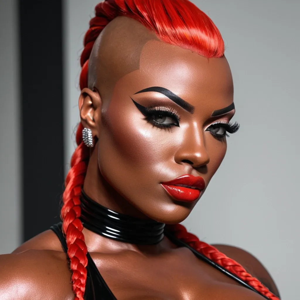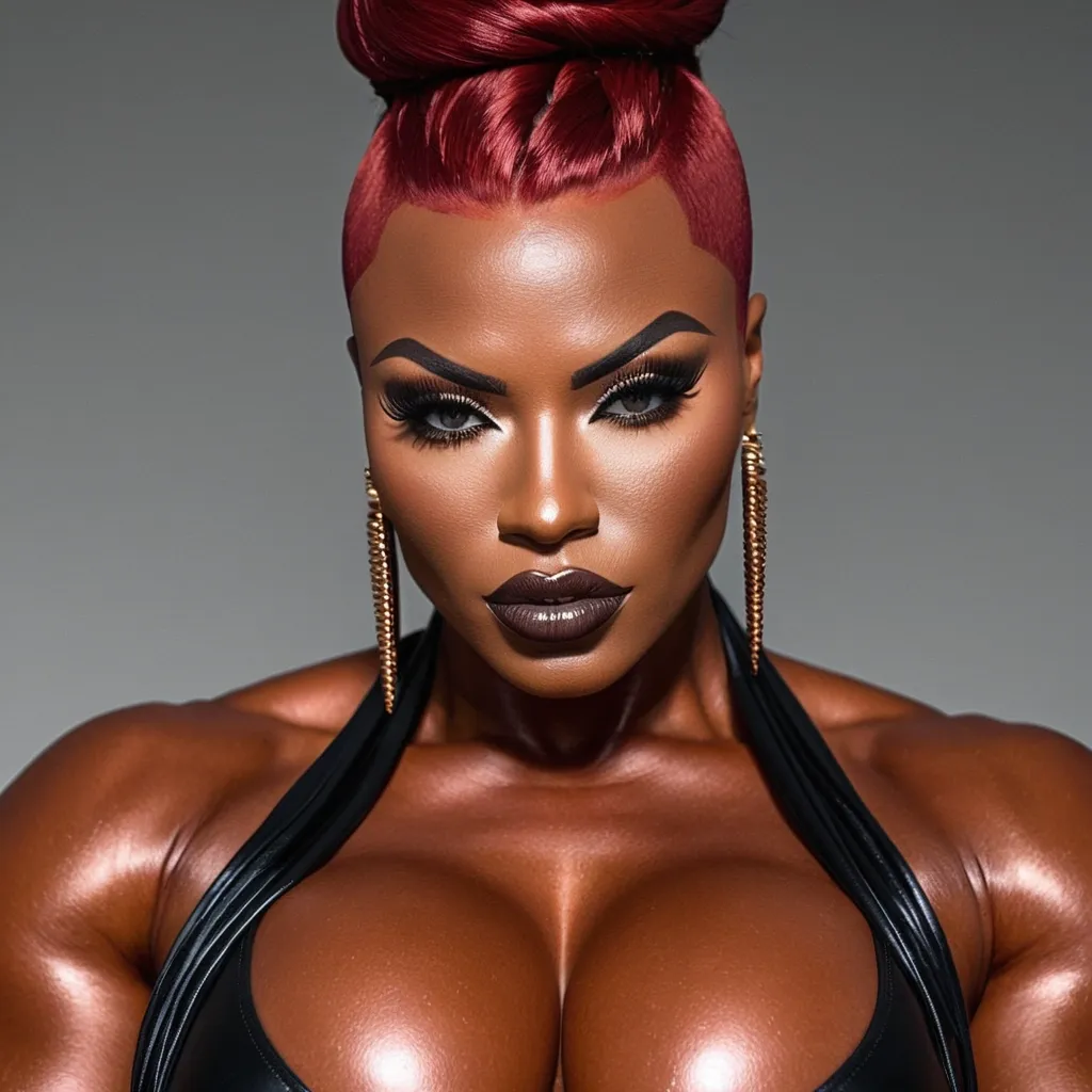 Generate Gorgeous female boss , very Dark-skinned african-American woman , bimbo , trimmed eyebrows pointy face , eyeliner , lipgloss , braided , mohawk designer , styled hair , bald on the side , black hair , bimbo , hourglass body , abnormally massive female bodybuilder , gorgeous , close up , full lips , big booty , redheaded , face and breast , feminine silhouette , too big breast , big booty , sexy thighs abs , silhouette , up close , flexing biceps , strikingly beautiful hazel eyes , legs are iconic and defining physical feature , both visually and in terms of combat ability.wearing an outfit that is a striking blend of elegance , power , and femininity , designed to command attention in any room. The suit is tailored to perfection , hugging the wearer’s curves with precision while emphasizing a structured silhouette. The fabric itself is a refined grey tweed patterned with subtle white grid lines , giving the suit a texture that feels both sophisticated and modern. The blazer features broad blue lapels and gold button accents , adding a luxurious touch that elevates the look beyond typical business attire. The matching high-waisted trousers elongate the frame , further enhancing the poised and commanding effect of the ensemble.The styling choices amplify the boldness of the suit. The inner blouse is a silky , greybutton-down shirt that complements the tweed’s tone while introducing a softer , feminine balance to the sharp tailoring of the jacket. The blouse peeks out neatly from under the blazer , maintaining elegance without drawing focus away from the suit’s commanding cut. Accessories are kept minimal yet intentional: a delicate layered gold necklace and hoop earrings that add glimmers of light and luxury without overpowering the outfit. The choice of voluminous , honey-brown braids cascading down her shoulders frames the face with both confidence and glamour , completing the commanding visual.Altogether , this look communicates a blend of authority and allure. It is business-ready yet fashion-forward , balancing corporate structure with vibrant femininity. The color palette blue , grey and gold avoids being overly delicate , instead embracing the richness of texture , structure , and presence. This is the kind of ensemble that speaks to ambition , sophistication , and personal style—ideal for someone who thrives in positions of influence but insists on expressing her individuality with bold elegance. It’s not just clothing—it’s a statement of power wrapped in grace. In luxury living legs that could crush a watermelon , skirt high boots are a bold and striking statement piece , crafted in glossy black patent leather that gives them a sleek , polished finish. Rising to just below the knee , the boots feature three adjustable buckle straps along the shaft , adding both edge and detail to their design. The towering stiletto heel , paired with a thick platform sole , creates an ultra-dramatic silhouette that elongates the leg and exudes power and confidence. With their combination of shine , height , and structure , these boots perfectly balance fierce femininity with high-fashion allure , stunning face ,