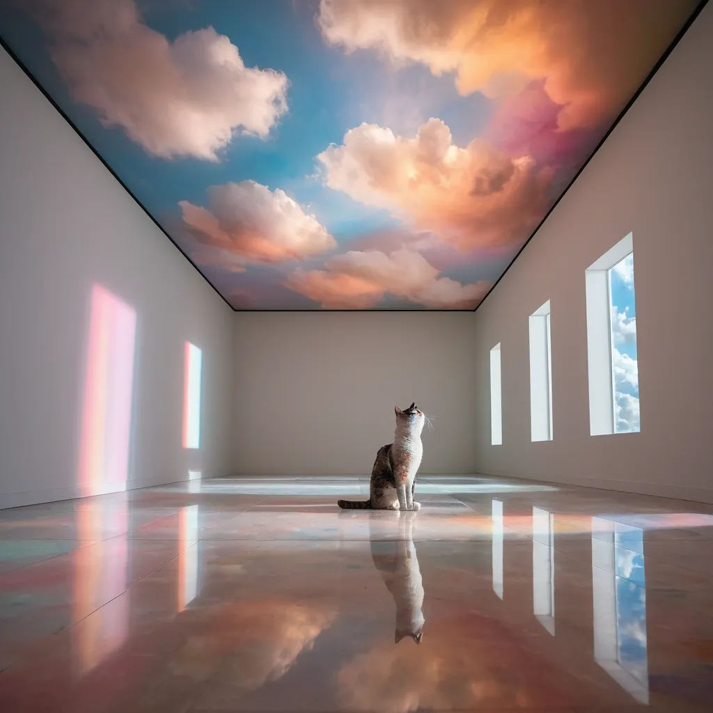 surreal fine art photography , art installation multicolored clouds suspended from the ceiling , cloud softly textured and illuminated with warm , diffused light in a modern minimalist gallery with a highly reflective floor , one cat stands below , gazing upward in awe as the clouds glow gently from within , shot on a Canon EOS 5D Mark IV with a Canon EF 24mm f/1.4L II USM lens at f/2.8 for shallow depth of field and hyperrealistic detail --ar 9:16 --quality 2 --style raw --stylize 200 ,