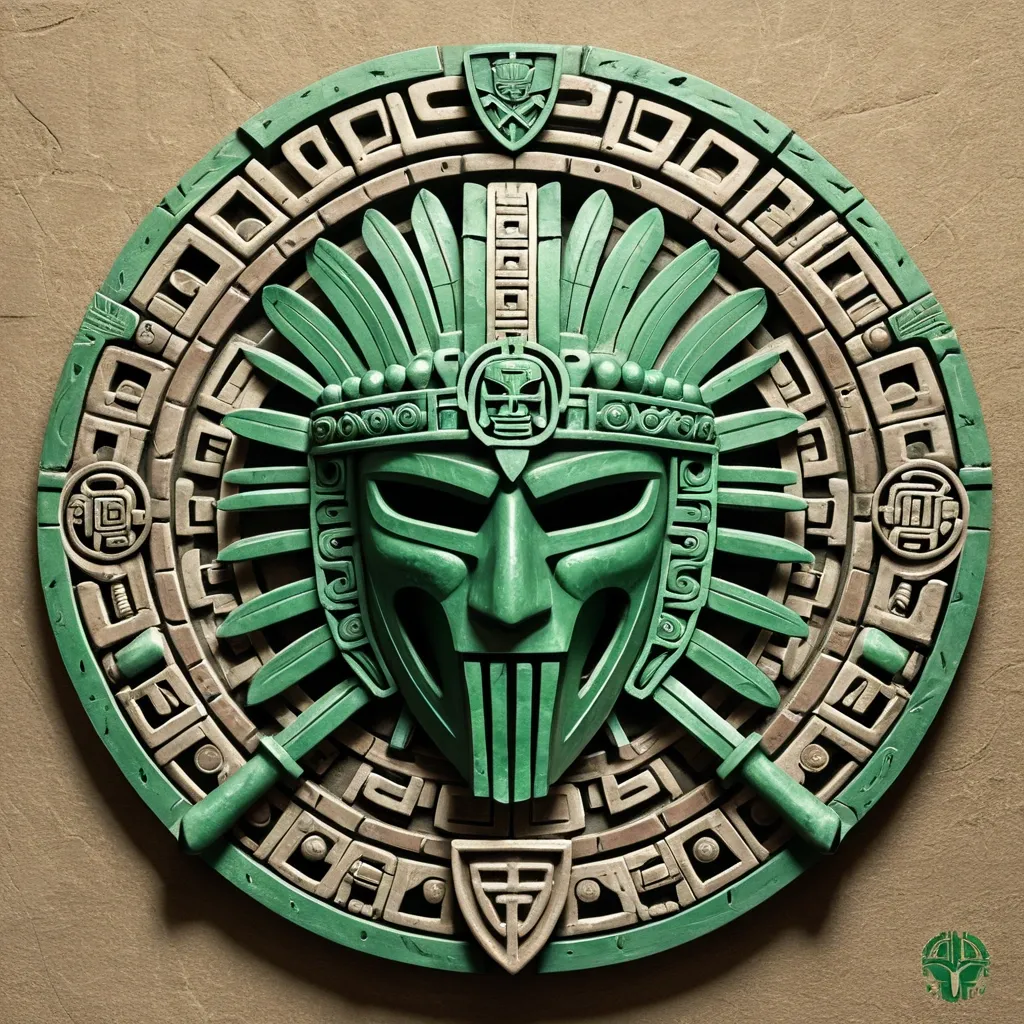 logo relacionado a méxico , con Un guerrero mexica estilizado (no fotorrealista) , Rasgos simbólicos o escultóricos (tipo relieve , máscara o iconografía prehispánica) , Manteniendo la rodela , los fusiles cruzados , la simetría y el texto “Fuerza Conjunta Verde” arriba y al centro de la rodela , dos fusiles cruzados rostro simbólico tipo máscara mexica” o “guerrero azteca estilizado en bajo relieve” ,