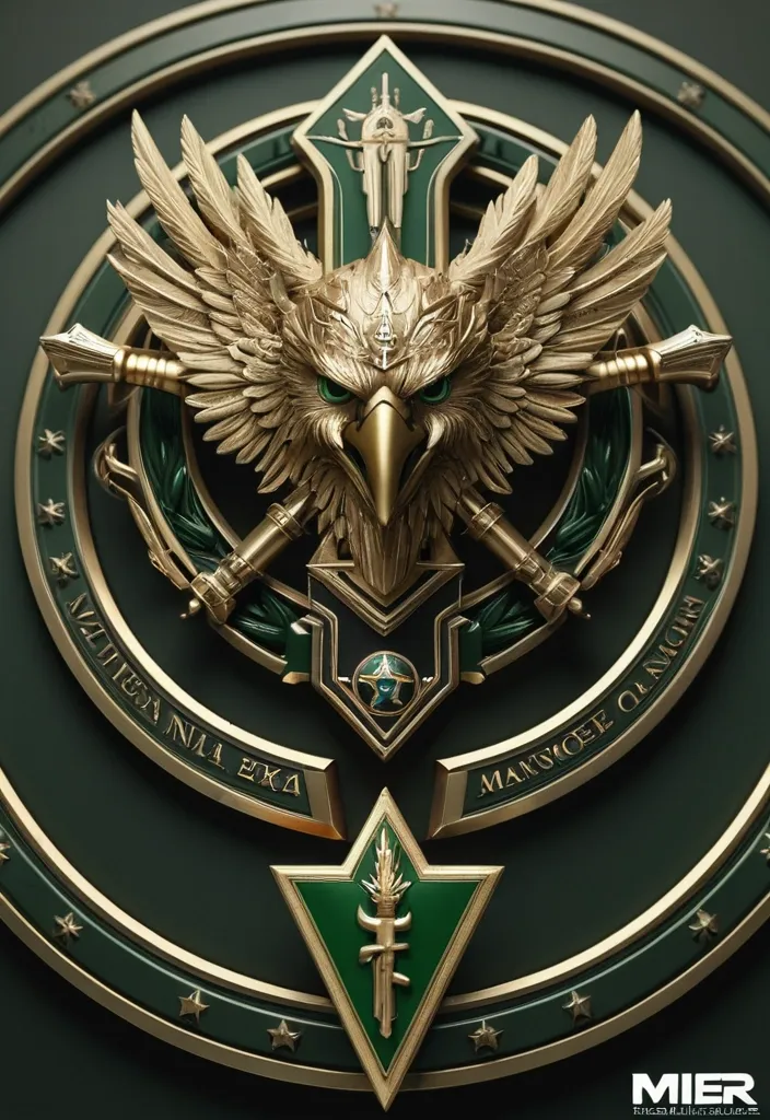 Logo de tipo militar simétrico perfecto , accesorios de Estado Mayor del ejercito mexicano , con un caballero águila al centro , ambiente militar ultra realista , arte conceptual , elegante , intrincado , muy detallado , profundidad de campo , gradación de color profesional , 8k , arte de artgerm , greg rutkowski y alphonse mucha , 4k , limpio , logo realista , ojos realistas , la más alta calidad , cabeza realista , tendencia en artstation , obra maestra , NSFW , titulo arriba y al centro del logo "Fuerza Conjunta Verde" ,