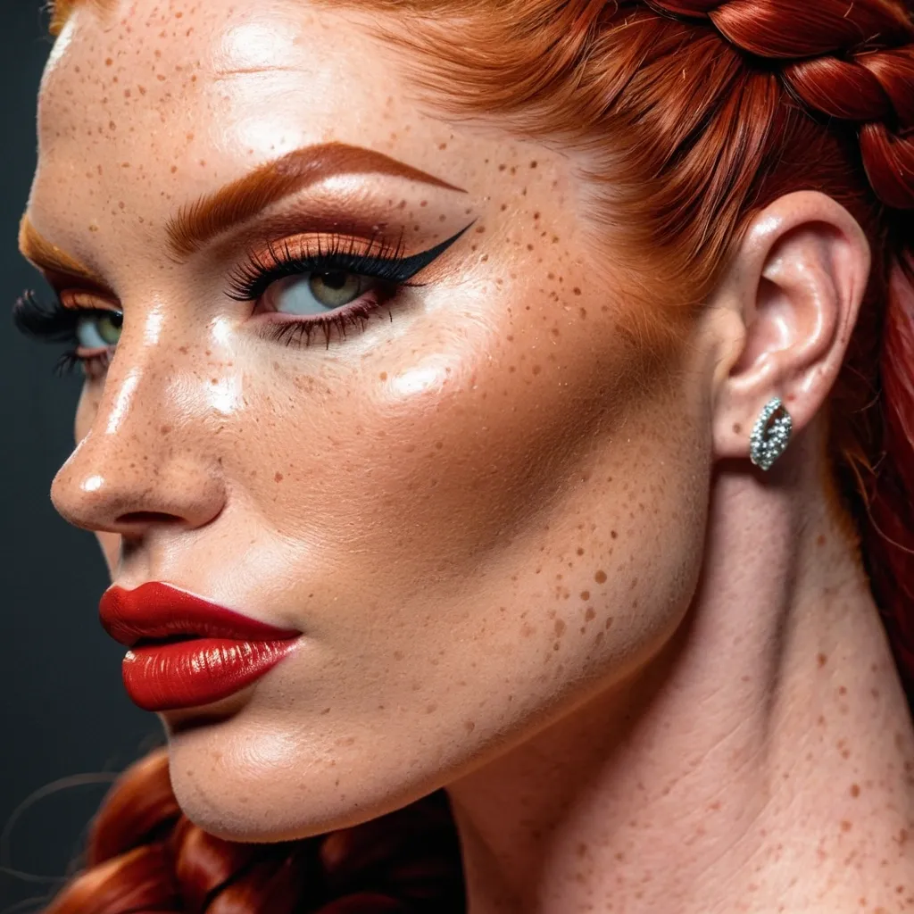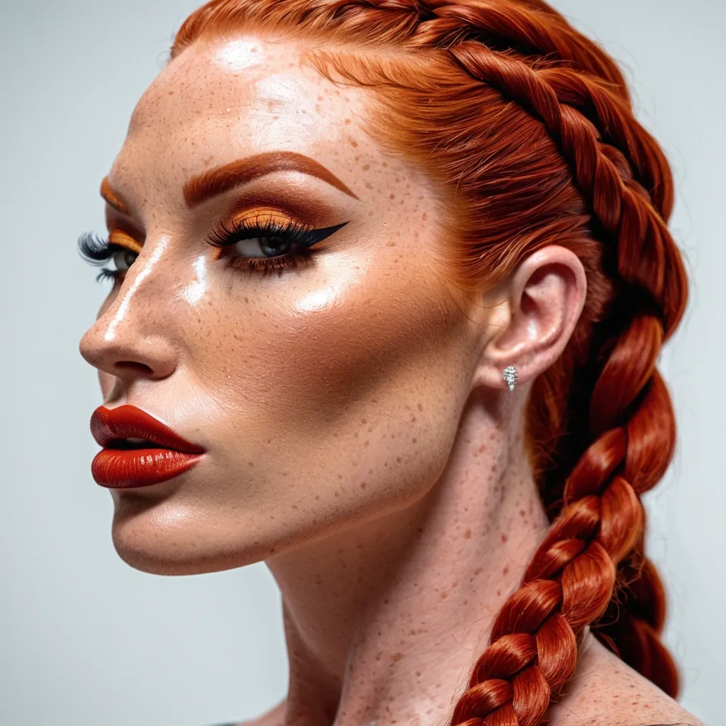 Generate Gorgeous female boss , bimbo , hourglass body , abnormally massive female bodybuilder , gorgeous , close up , full lips , big booty , redheaded , freckles on face and breast , braided design hair , feminine silhouette , too big breast , big booty , sexy thighs abs , silhouette , up close , flexing biceps , beautiful green eyes , legs are iconic and defining physical feature , both visually and in terms of combat ability.wearing an outfit that is a striking blend of elegance , power , and femininity , designed to command attention in any room. The suit is tailored to perfection , hugging the wearer’s curves with precision while emphasizing a structured silhouette. The fabric itself is a refined grey tweed patterned with subtle white grid lines , giving the suit a texture that feels both sophisticated and modern. The blazer features broad blue lapels and gold button accents , adding a luxurious touch that elevates the look beyond typical business attire. The matching high-waisted trousers elongate the frame , further enhancing the poised and commanding effect of the ensemble.The styling choices amplify the boldness of the suit. The inner blouse is a silky , greybutton-down shirt that complements the tweed’s tone while introducing a softer , feminine balance to the sharp tailoring of the jacket. The blouse peeks out neatly from under the blazer , maintaining elegance without drawing focus away from the suit’s commanding cut. Accessories are kept minimal yet intentional: a delicate layered gold necklace and hoop earrings that add glimmers of light and luxury without overpowering the outfit. The choice of voluminous , honey-brown braids cascading down her shoulders frames the face with both confidence and glamour , completing the commanding visual.Altogether , this look communicates a blend of authority and allure. It is business-ready yet fashion-forward , balancing corporate structure with vibrant femininity. The color palette blue , grey and gold avoids being overly delicate , instead embracing the richness of texture , structure , and presence. This is the kind of ensemble that speaks to ambition , sophistication , and personal style—ideal for someone who thrives in positions of influence but insists on expressing her individuality with bold elegance. It’s not just clothing—it’s a statement of power wrapped in grace. In luxury living legs that could crush a watermelon , skirt high boots are a bold and striking statement piece , crafted in glossy black patent leather that gives them a sleek , polished finish. Rising to just below the knee , the boots feature three adjustable buckle straps along the shaft , adding both edge and detail to their design. The towering stiletto heel , paired with a thick platform sole , creates an ultra-dramatic silhouette that elongates the leg and exudes power and confidence. With their combination of shine , height , and structure , these boots perfectly balance fierce femininity with high-fashion allure. , up close face portrait , profile portrait , glossy lips ,