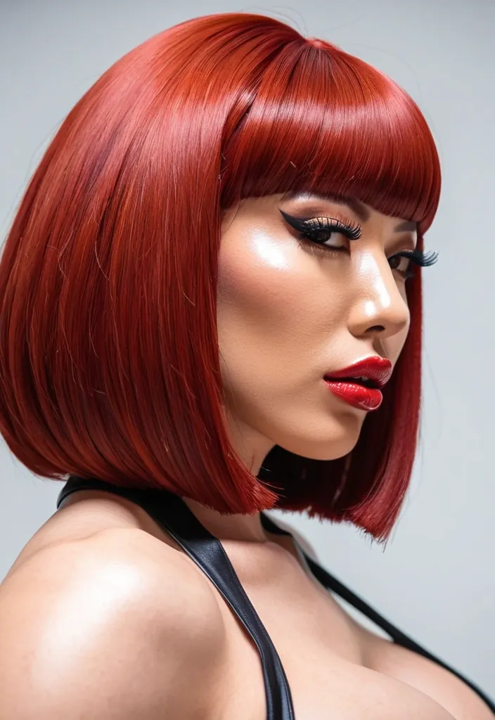 Generate Gorgeous female boss , Japanese woman , pointy face , bimbo , hourglass body , abnormally massive female bodybuilder , gorgeous , close up , full lips , big booty , red hair breast , bob-cut , bangs cover forhead design hair , feminine silhouette , too big breast , big booty , sexy thighs abs , silhouette , up close , flexing biceps , beautiful green eyes , legs are iconic and defining physical feature , both visually and in terms of combat ability.wearing an outfit that is a striking blend of elegance , power , and femininity , designed to command attention in any room. The suit is tailored to perfection , hugging the wearer’s curves with precision while emphasizing a structured silhouette. The fabric itself is a refined grey tweed patterned with subtle white grid lines , giving the suit a texture that feels both sophisticated and modern. The blazer features broad blue lapels and gold button accents , adding a luxurious touch that elevates the look beyond typical business attire. The matching high-waisted trousers elongate the frame , further enhancing the poised and commanding effect of the ensemble.The styling choices amplify the boldness of the suit. The inner blouse is a silky , greybutton-down shirt that complements the tweed’s tone while introducing a softer , feminine balance to the sharp tailoring of the jacket. The blouse peeks out neatly from under the blazer , maintaining elegance without drawing focus away from the suit’s commanding cut. Accessories are kept minimal yet intentional: a delicate layered gold necklace and hoop earrings that add glimmers of light and luxury without overpowering the outfit. The choice oframes the face with both confidence and glamour , completing the commanding visual.Altogether , this look communicates a blend of authority and allure. It is business-ready yet fashion-forward , balancing corporate structure with vibrant femininity. The color palette blue , grey and gold avoids being overly delicate , instead embracing the richness of texture , structure , and presence. This is the kind of ensemble that speaks to ambition , sophistication , and personal style—ideal for someone who thrives in positions of influence but insists on expressing her individuality with bold elegance. It’s not just clothing—it’s a statement of power wrapped in grace. In luxury living legs that could crush a watermelon , skirt high boots are a bold and striking statement piece , crafted in glossy black patent leather that gives them a sleek , polished finish. Rising to just below the knee , the boots feature three adjustable buckle straps along the shaft , adding both edge and detail to their design. The towering stiletto heel , paired with a thick platform sole , creates an ultra-dramatic silhouette that elongates the leg and exudes power and confidence. With their combination of shine , height , and structure , these boots perfectly balance fierce femininity with high-fashion allure. Gorgeous brown eyes , nose ring , big lips glossy lips , enormous breast , enormous butt , sideProfile face portrait ,
