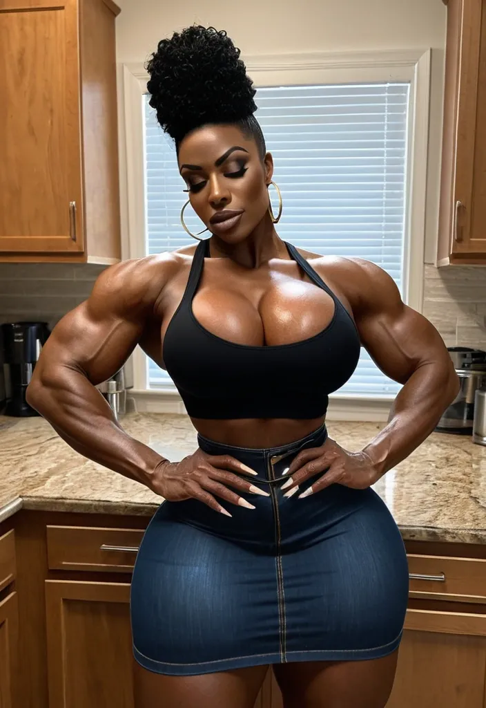 34 years old , Generate Gorgeous female boss , bimbo , abnormally massive woman , dark African-American woman , hourglass body , female bodybuilder , gorgeous , close up , full lips , big booty , black hair , natural pompadour design hair , feminine silhouette , too big breast , big booty , sexy thighs abs , silhouette , up close , flexing biceps , beautiful dark brown eyes , legs are iconic and defining physical feature , both visually and in terms of combat ability.wearing an outfit that is a striking blend of elegance , power , and femininity , designed to command attention in any room. The suit is tailored to perfection , hugging the wearer’s curves with precision while emphasizing a structured silhouette. The fabric itself is a refined grey tweed patterned with subtle white grid lines , giving the suit a texture that feels both sophisticated and modern. The blazer features broad blue lapels and gold button accents , adding a luxurious touch that elevates the look beyond typical business attire. The matching high-waisted trousers elongate the frame , further enhancing the poised and commanding effect of the ensemble.The styling choices amplify the boldness of the suit. The inner blouse is a silky , greybutton-down shirt that complements the tweed’s tone while introducing a softer , feminine balance to the sharp tailoring of the jacket. The blouse peeks out neatly from under the blazer , maintaining elegance without drawing focus away from the suit’s commanding cut. Accessories are kept minimal yet intentional: a delicate layered gold necklace and hoop earrings that add glimmers of light and luxury without overpowering the outfit. The choice of voluminous , honey-brown braids cascading down her shoulders frames the face with both confidence and glamour , completing the commanding visual.Altogether , this look communicates a blend of authority and allure. It is business-ready yet fashion-forward , balancing corporate structure with vibrant femininity. The color palette blue , grey and gold avoids being overly delicate , instead embracing the richness of texture , structure , and presence. This is the kind of ensemble that speaks to ambition , sophistication , and personal style—ideal for someone who thrives in positions of influence but insists on expressing her individuality with bold elegance. It’s not just clothing—it’s a statement of power wrapped in grace. In luxury living legs that could crush a watermelon , skirt and computer lab standing over computer close up , full lips , big booty , shiny brown hair , feminine silhouette , too big breast , big booty , sexy thighs abs , silhouette , up close , flexing biceps , beautiful brown eyes closed top. , modest , gold tank top , blue jean skirt , standing in kitchen ,