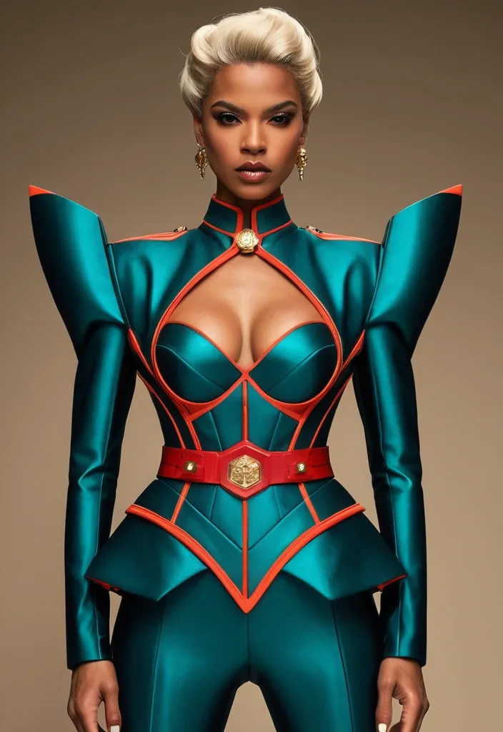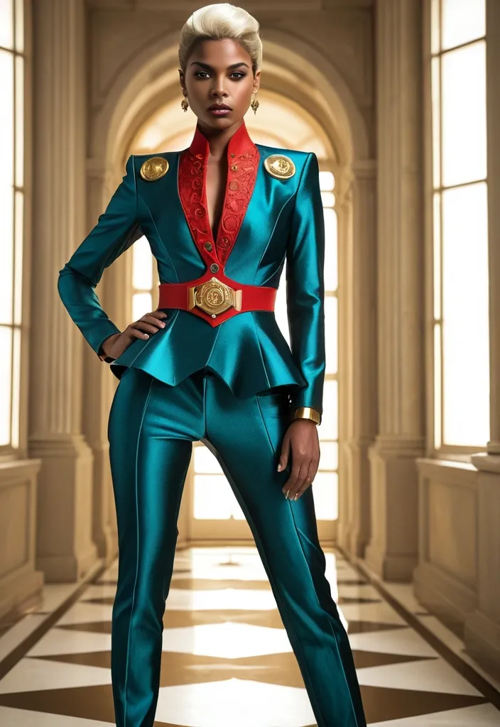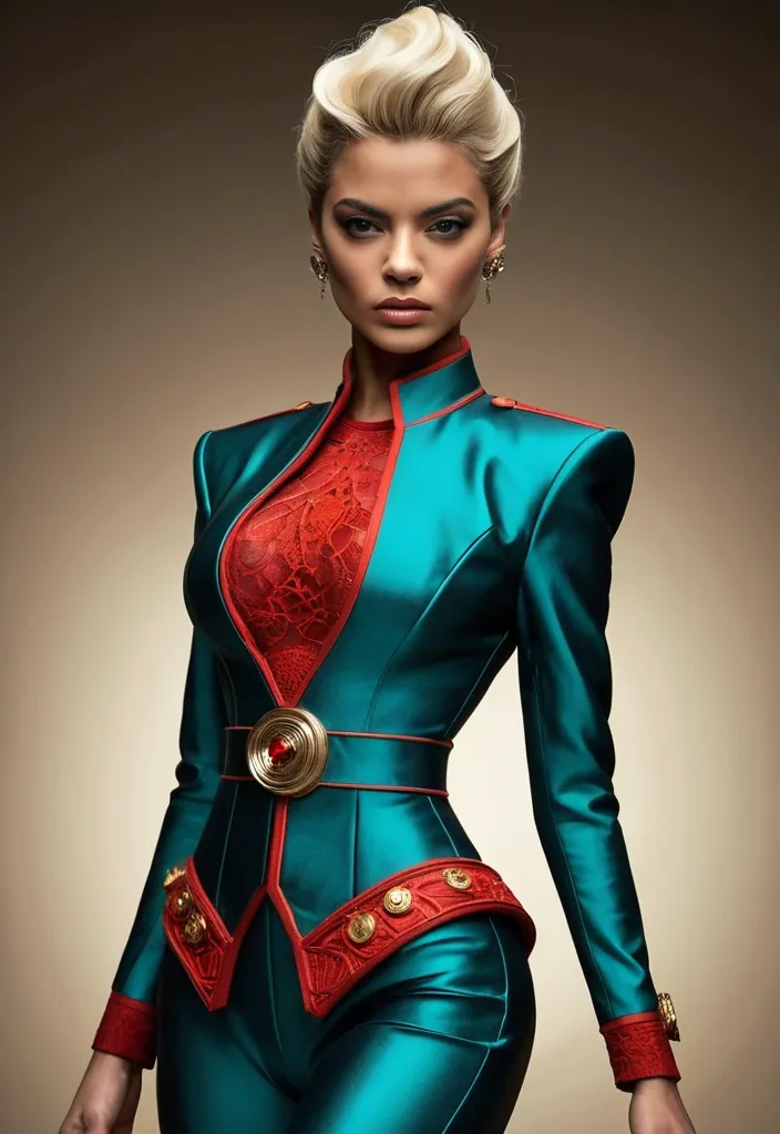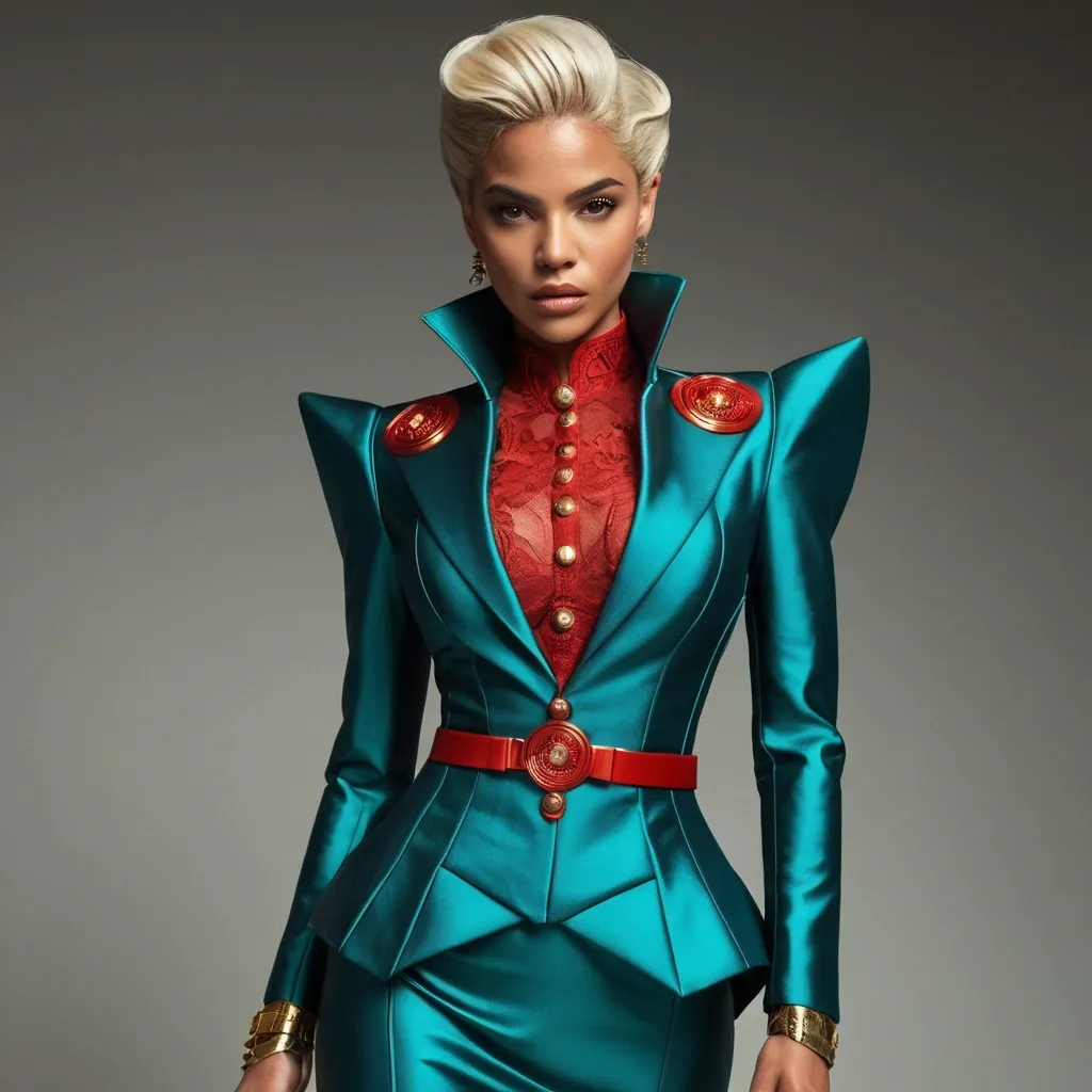 This woman is the very definition of commanding elegance. Her light caramel-toned skin glows under the cinematic lighting , enhancing the symmetry of her striking face. Her hazel eyes are magnetic , wide and luminous , carrying a depth that draws in anyone who dares to hold her gaze. Her brows are sharp and expressive , while her full lips , painted with precision , complete a look that balances power and allure. The hairstyle is a platinum-blonde sculpted wave , coiffed with a retro-futuristic flair , giving her an almost regal presence that feels timeless yet forward-looking.Her body is sculpted into an hourglass silhouette that radiates strength and femininity in equal measure. Broad shoulders flow into a slim , cinched waist , then flare into shapely hips , presenting the physique of a woman both athletic and sensual. The sharp tailoring of her outfit exaggerates this shape , every seam and line designed to accentuate her powerful frame. She stands poised , every movement deliberate , carrying the weight of someone who knows the room bends to her presence.Her clothing is a bold artistic statement. A metallic teal suit with structured shoulders and a flared peplum waist creates an armored elegance , almost like futuristic couture battle gear. A vivid red lace center panel runs down her torso , fastened with golden buttons , blending softness and ferocity. The matching bow tie adds a touch of playful precision , while gold jewelry—bracelets and ornate earrings—catch the light like royal insignias. Altogether , her attire transforms her into a vision of sophistication and power , the kind of woman who dominates both fashion and destiny with the same unshakable confidence. ,