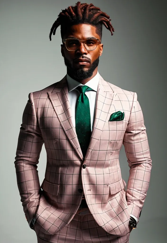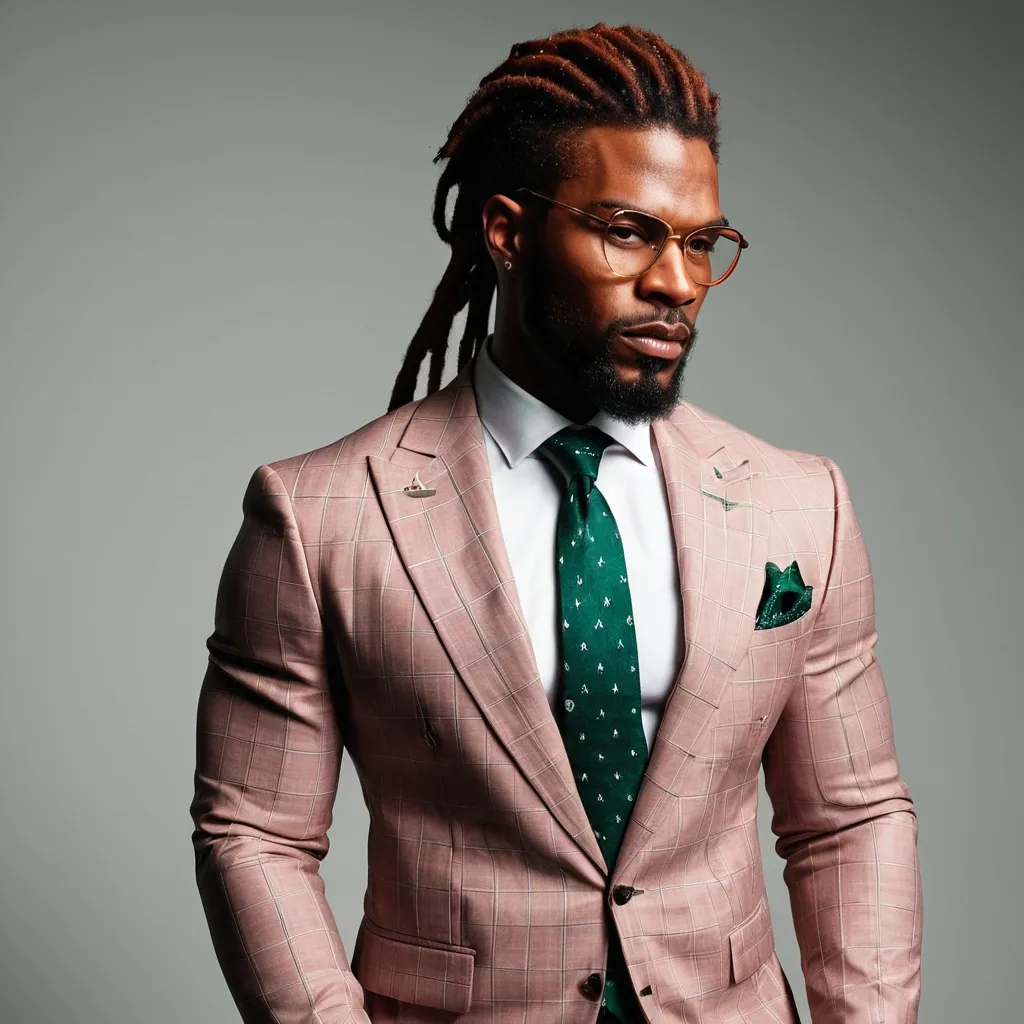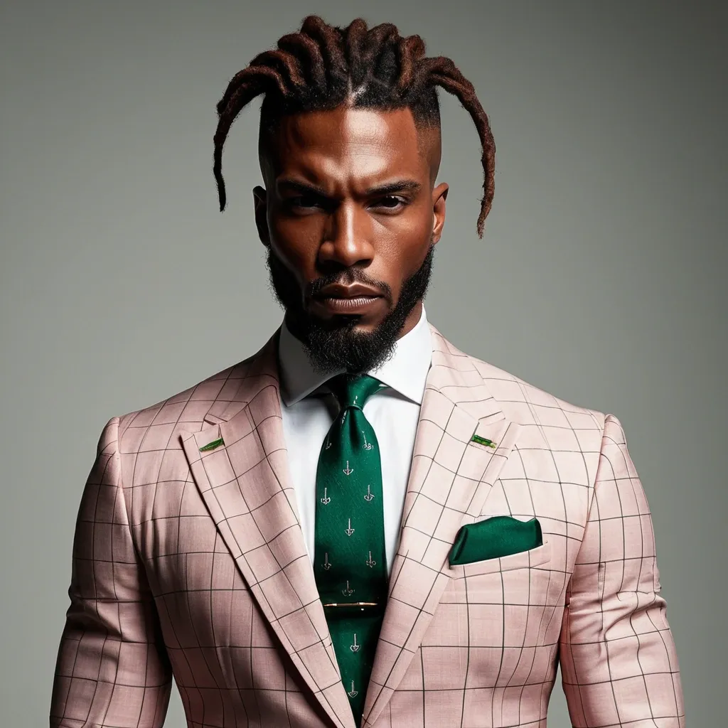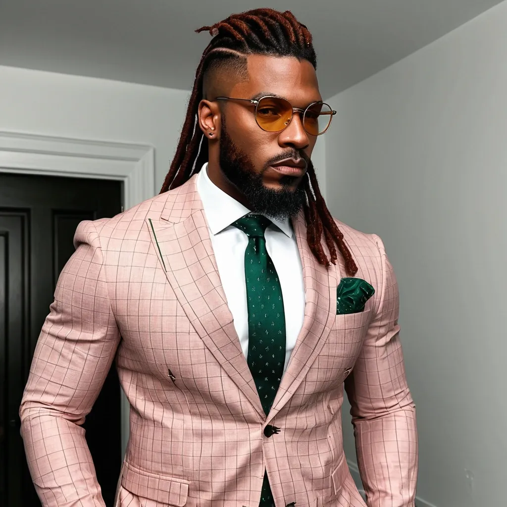 African-American man , This man radiates presence the moment you lay eyes on him. His face is carved with bold , confident lines—strong jaw , neatly groomed beard , reddish brown hair , long dreadlocks , and sharp cheekbones that command respect. His hairstyle , dreadlocks twisted neatly on top and faded at the sides , adds both edge and sophistication , a modern crown that frames his intensity. His amber-tinted glasses are a masterstroke: not just an accessory , but a statement , softening his power with a layer of intellectual cool.His body is built like a fortress—broad shoulders , full chest , and arms that stretch the very seams of his suit. The pink checkered jacket contrasts brilliantly with his muscular frame , a daring choice that turns heads yet remains perfectly refined. The white shirt beneath anchors the look , while the emerald tie and matching pocket square bring richness , suggesting not just style , but taste. Every detail feels intentional , like he knows the effect he has and chooses to amplify it.What truly elevates him , though , is the aura: a blend of strength and polish that feels untouchable yet magnetic. He looks like someone who owns the room without needing to announce it , the kind of man whose silence is louder than most people’s words. Between the meticulous tailoring , the flawless grooming , and his sheer physicality , he doesn’t just wear a suit—he wears power , charisma , and authority. ,