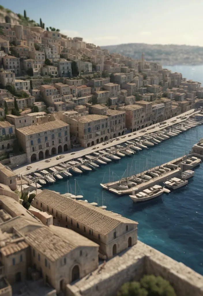 Massilia , Roman Gaul port city on the Mediterranean , marble quays lined with ships and warehouses , hillside villas above bustling markets , sunlight over calm blue bay , late summer afternoon , Style: Matte Painting , detailed and atmospheric with subtle depth of field , Wide view , Side View , 4K. ,