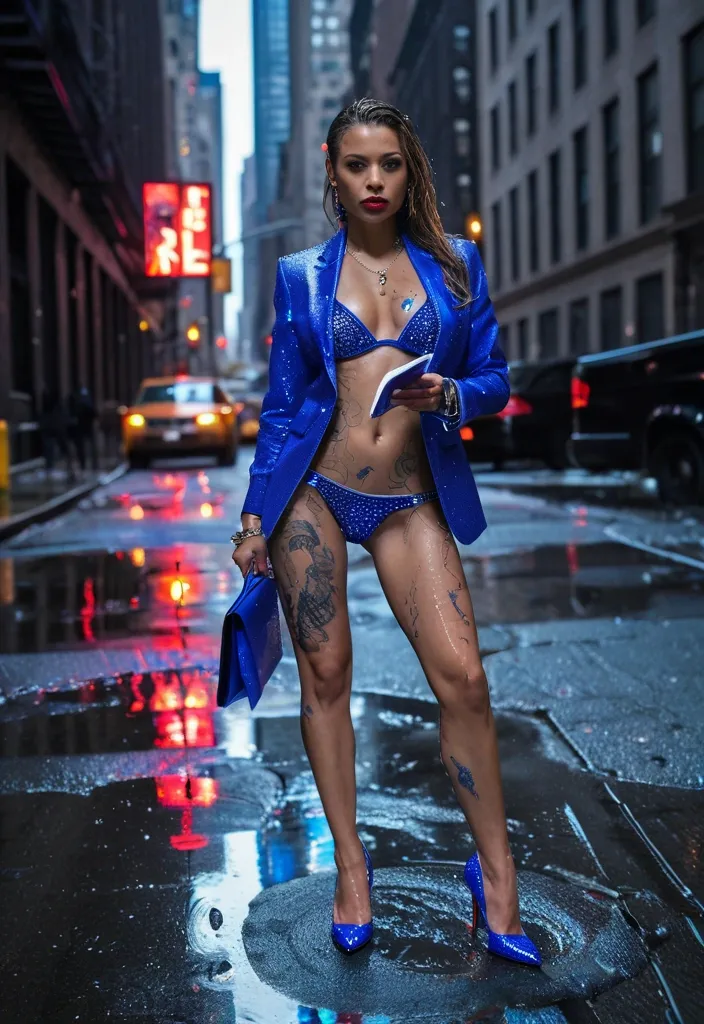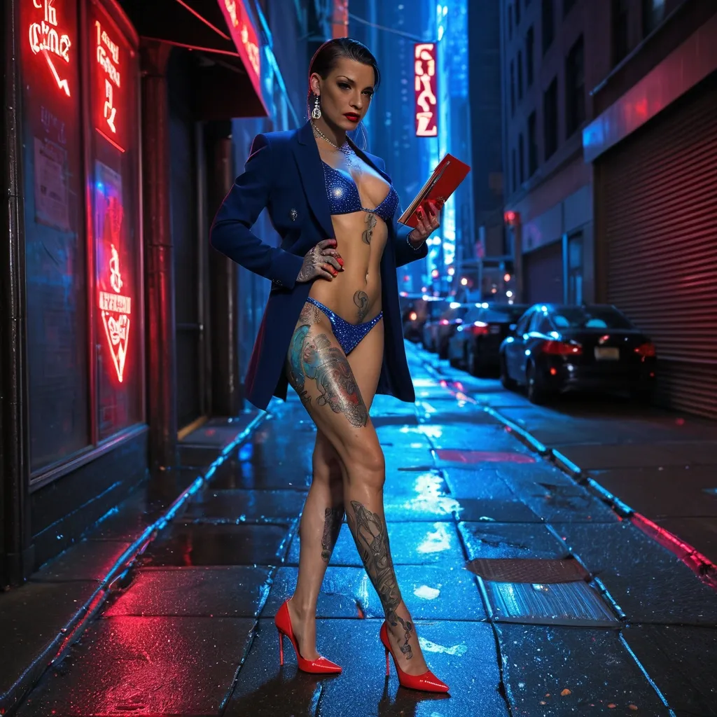 On a glistening New York City street after rain , a bold female detective wears a royal blue Swarovski-encrusted bikini with matching blazer. Intricate body tattoos peek through as she stands confidently in crimson Louboutin heels , holding an evidence file while neon reflections dance across wet concrete. ,