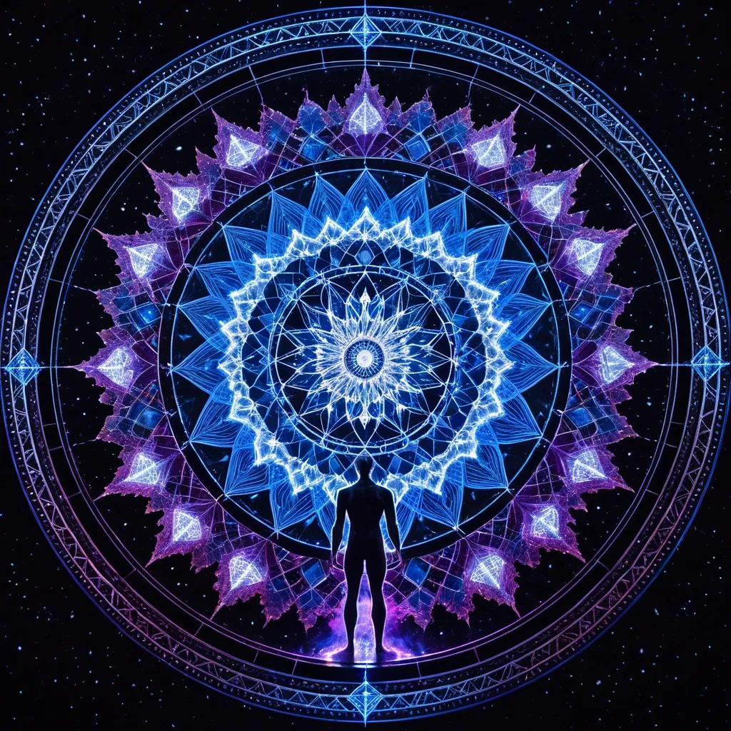 An aerial perspective looking down at a single human figure standing at the exact center of an intricate sacred geometry mandala drawn in light on a dark mirror-like surface. The mandala radiates outward in concentric rings of luminous white , electric blue and deep magenta , each ring more complex than the last. The figure is small but perfectly centered — calm , still , powerful. Around the outer edges of the mandala , the surface dissolves into stars and deep space. The contrast between the geometric order at the center and the infinite cosmos at the edges creates a feeling of being simultaneously grounded and boundless. Ultra-wide lens distortion at edges. Bioluminescent glow quality. - Energy flow: • Truth current: Diamond-light beams piercing illusions • Harmony wave: Violet mist dissolving sharp edges - Background: Holographic Schwarzwald merging with nebula , trees made of starlight and silence - Sacred details: » Stork's eye contains rotating galaxy with "Sein" written in light » Cannabis trichomes refracting truth-light into rainbow prisms » Coffee bean cracks revealing microscopic mandalas - Style: Micro/macro cosmic realism , Esao Andrews meets Hubble photography - Light alchemy: » Bioluminescent truth (wavelength 540nm) » Phosphorescent harmony (wavelength 420nm) » Unified glow where spectrums merge (golden-white) --ar 1:1 --detail 32k --quantum_healing ,