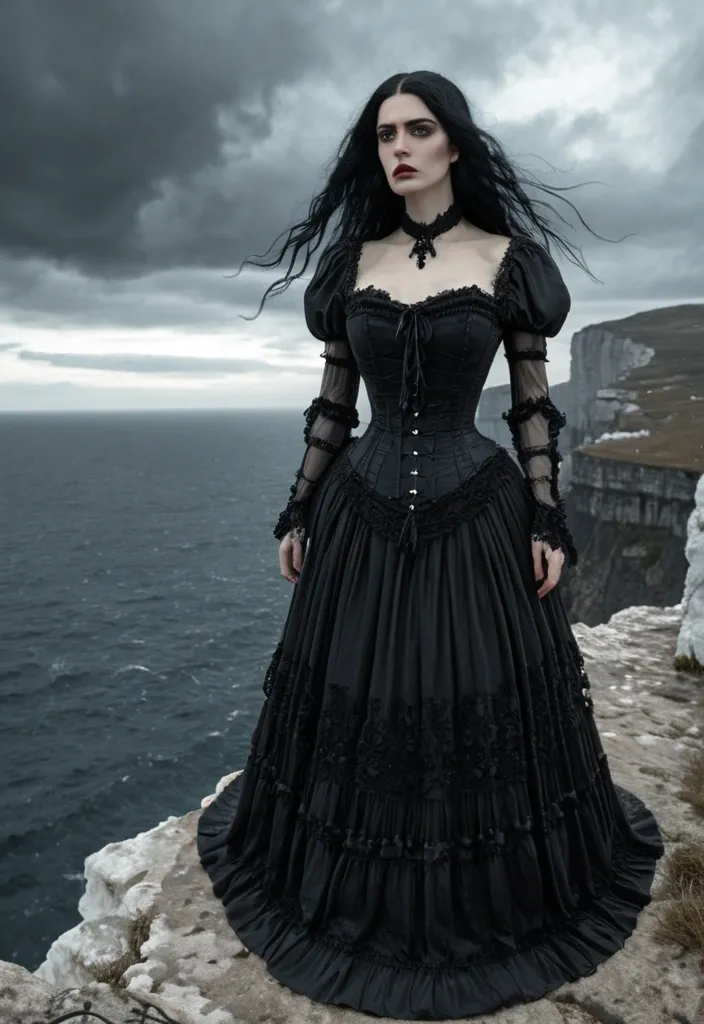Dark gothic romance fantasy , Photorealistic , 3d studio photography quality , incredibly gorgeous compassionate lady stands on a circular stone balcony overlooking the rugged ocean at night , ((dark rainy stormy night)) , beautiful serene vibes , mysterious , hauntingly beautiful , she wears an old fashioned Victorian indigo gown , her long gorgeous curly long hair is partially styled up , beautiful eyes , muted makeup , standing next to fluffy black cat , soft batik , ominous ethereal , surreal ar-9:16 ,