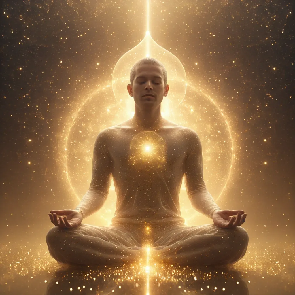 (masterpiece:1.3) , best quality , 8k , (pure being:1.5) , a figure in deep meditation , half-transparent and merging with the cosmos , surrounded by soft golden light and floating particles of peace , no action , no desire , only presence , style of Johnathon Bowcott and Daniel B. Holeman , spiritual serenity , divine emptiness , cosmic unity , no self , only awareness , ultra realistic , ethereal atmosphere , subtle glow ,