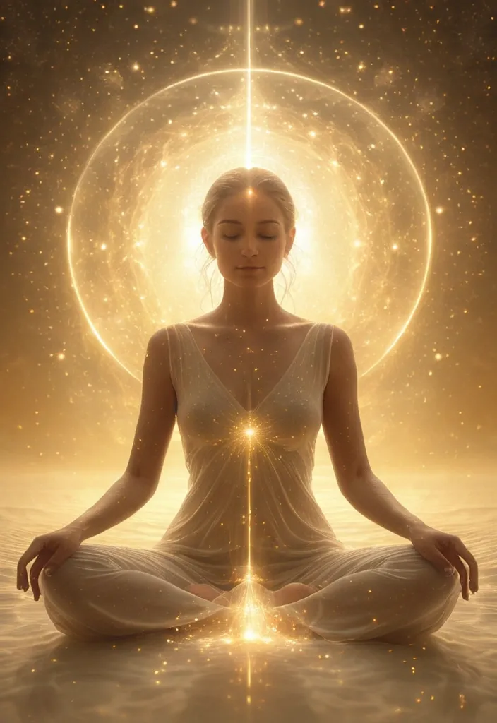 (masterpiece:1.3) , best quality , 8k , (pure being:1.5) , a woman in deep meditation , half-transparent and merging with the cosmos , surrounded by soft golden light and floating particles of peace , no action , no desire , only presence , style of Johnathon Bowcott and Daniel B. Holeman , spiritual serenity , divine emptiness , cosmic unity , no self , only awareness , ultra realistic , ethereal atmosphere , subtle glow ,