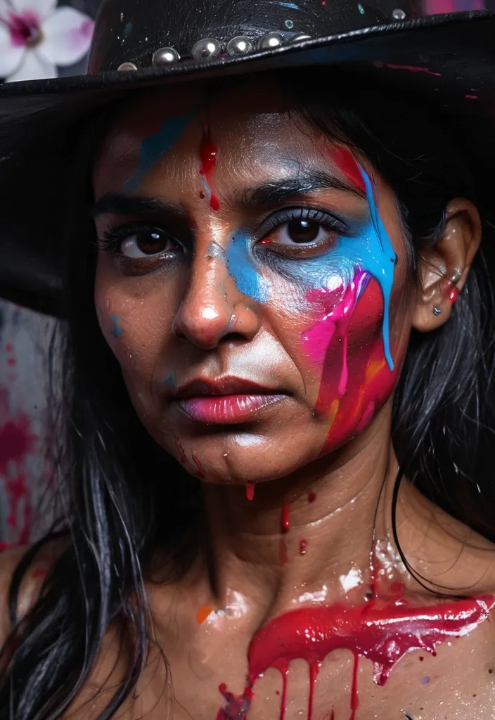 Extreme macro close-up , high contrast , low-key lighting portrait of a 48 years old Indian woman wearing a wide-brimmed cowboy hat with dark , slightly wet hair framing her face. She gazes forward , revealing blue eyes with winged eyeliner and rose eye-shadow. Vibrant blue , yellow , and red paint splatters adorn her face , left eye , nose , right shoulder , and chest. Her lips are bright red , skin smooth with a subtle sheen. A bright white orchid in her hair dripping with pink hints and washed ink mixed colors right. Paint also splatters the flower background is dark grey texture. Artistic , expressive , beauty and chaos. ,