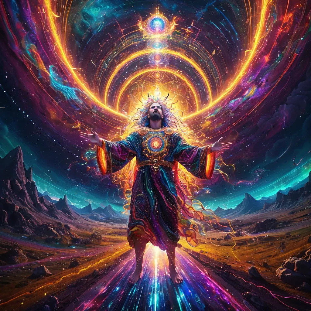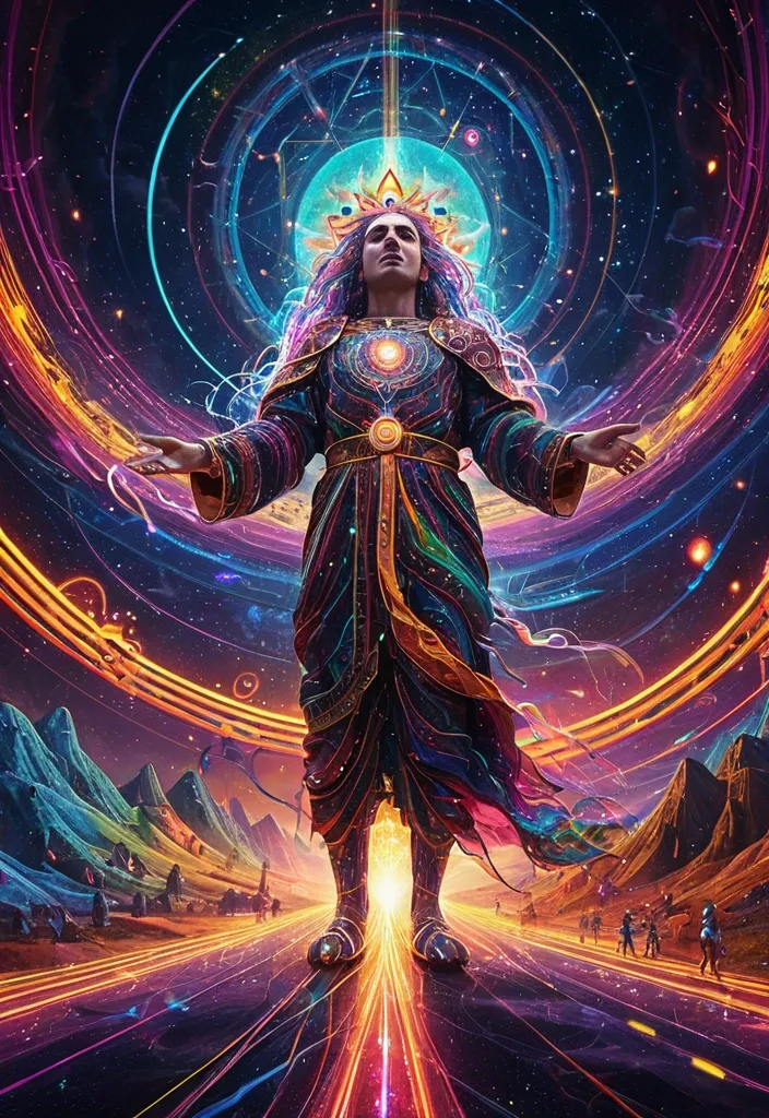 Panopticon maze Server: Gods arrive on earth , celestial procession , scared locals , landscape , vibrant colors , majestic , beautiful , Maximalist oil on canvas painting , Style: Celestial , ethereal , abstract , digital art Lighting: Dramatic backlighting , bright glowing particles , contrasting dark background Composition: Full body shot , dynamic diagonal composition , upward gaze Details: Sparkling hair and garment , streaking colorful light trails , sense of movement and wonder , magical atmosphere Quality: High detail , 4K , Masterpiece , Rendered in Octane ,