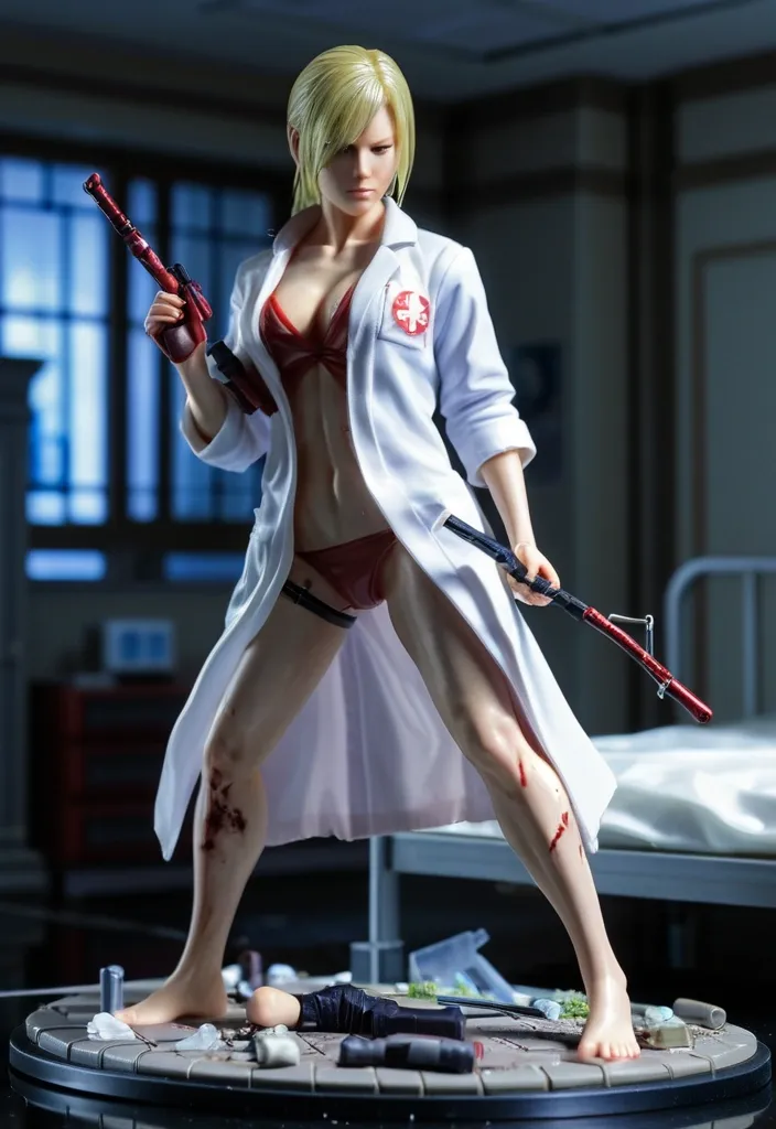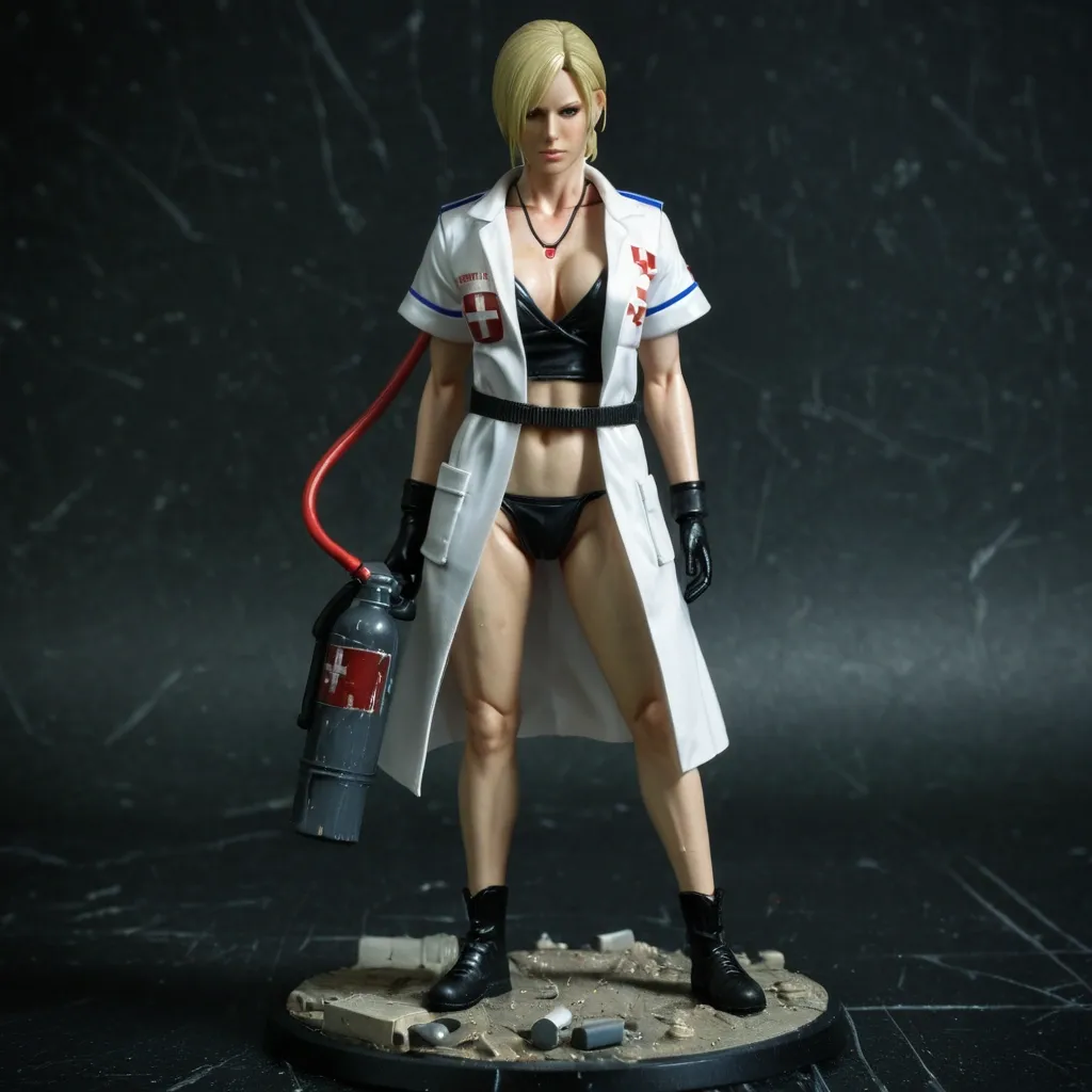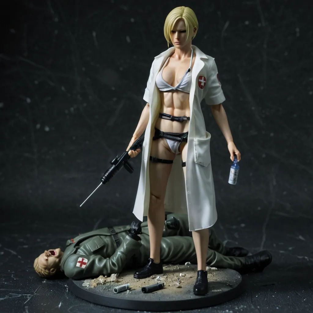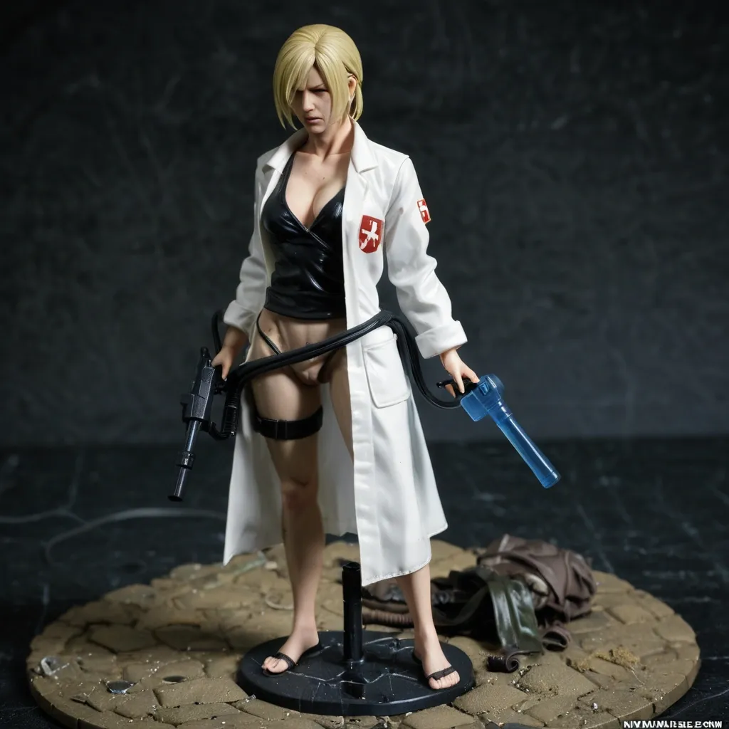 A sexy action figure of Sherry Birkin Resident Evil 6. She is in her hospital gown , this is a tabard style lose fitting item , for a medical procedure not a lab coat. It is lightly tied at the sides , has a plunge neck and hip length. She has no other clothes.she holds a pair of electrick stun batons. She Stands over a defeated soldier , he is in black and wears a mothern military gas mask.. on a diorama base ,