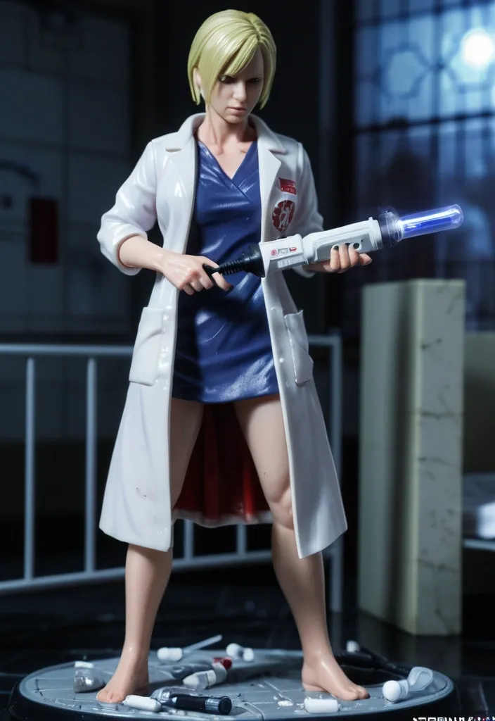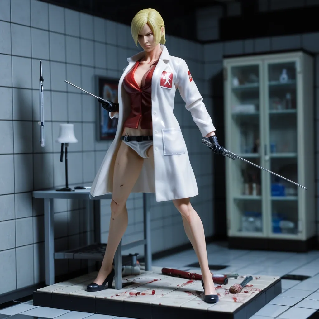 Resident Evil 6 , Sherry Birkin as an action figure on a diorama.Description Character Name: Sherry BirkinAge/Appearance: An adult woman , 26 (appearing in her late teens/early 20s due to the G-virus remnants) , 5' 5" (165 cm) tall.Physical Features: Short , blonde , bob-cut hair (shorter than her RE2 appearance) , and blue eyes. Hospital Gown and Attire Details Garment: A white patient/hospital gown. It is a simple , standard-issue test subject uniform.Style: It appears to be a back-tie or wrap-around style gown , somewhat loose-fitting , designed for a lab/medical setting rather than a fashionable piece of clothing. It is noted for being one of her less conservative outfits in the game , in contrast to her main campaign clothes.Color/Material: Plain white , likely a light , inexpensive fabric like cotton or a synthetic blend typical of institutional wear.Additional elements: She has no shoes or socks in this specific lab setting. There are no additional accessories , weapons , or gear. She may have some dirt/wounds or appear sweaty/wet depending on the specific moment being The scene is a sterile , dimly lit laboratory or containment area within a Neo-Umbrella facility in Lanshiang , China. This context can help the AI set the "A 3D render of Sherry Birkin from the video game Resident Evil 6 , an adult woman with short blonde bob-cut hair and blue eyes , wearing a plain white , back-tie hospital gown that is slightly loose-fitting. She is standing in a sterile , dimly lit laboratory. The image should capture her determined expression while looking vulnerable. Full body shot , realistic , high detail , video game character art , Capcom style , horror game atmosphere." ,