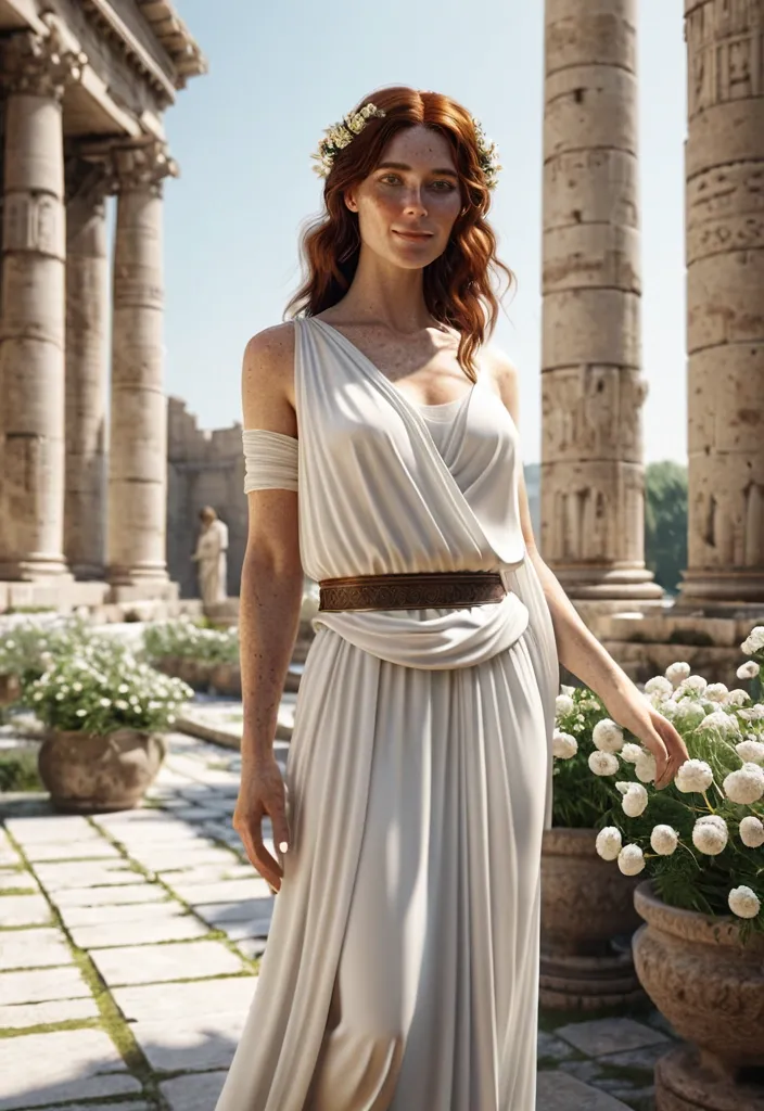 photorealistic , view of the ancient city of atlantis with flying futuristic airship , modern and antic construction , some people men and beautyful women in toga walking on streets , green plants all over the city and canalize water everywhere. a beautyful 30yo woman in openside mini-toga at very first plan ,