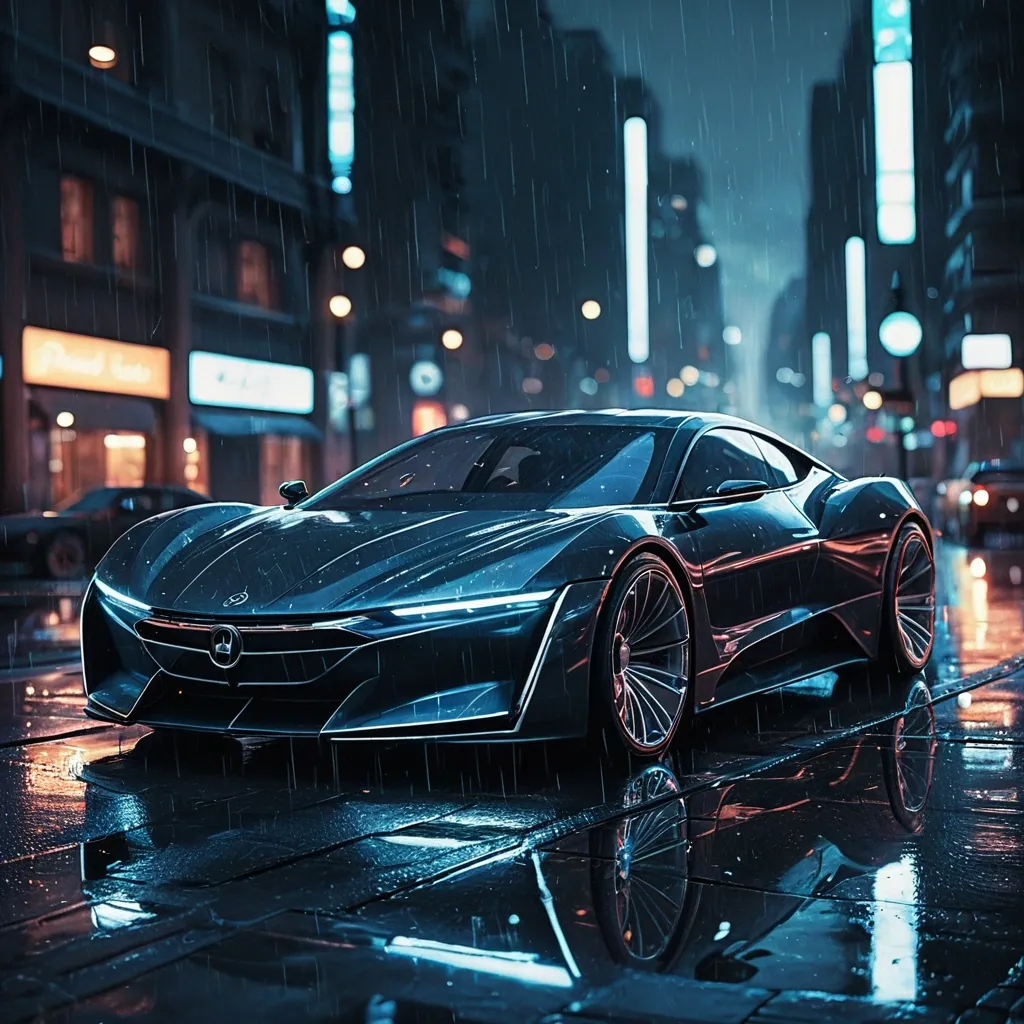 A hyper-realistic digital painting of a futuristic luxury sedan parked on a rain-slicked city street at night , with no traffic and an empty street. The car is a futuristic model with sharp angles , and the shot is a close-up focusing on the car’s front end , highlighting its aggressive styling. The car’s surface is highly reflective , mirroring the neon lights and wet pavement , adding to the overall futuristic and luxurious feel. The background features blurred city lights and buildings , creating a sense of depth and atmosphere. The overall texture is painterly , with visible brushstrokes that add a touch of artistic flair , and soft bokeh in the background to emphasize the car and create a dreamy , cinematic effect. ,