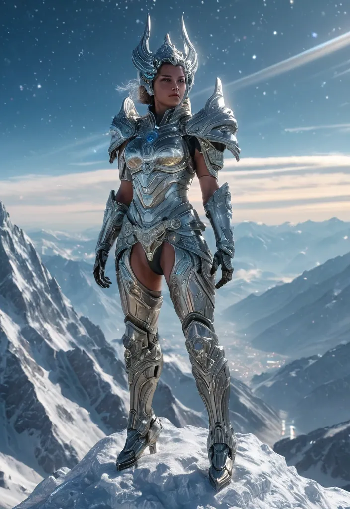 A majestic woman in ornate , futuristic armor standing atop a snow-capped mountain peak , overlooking a nebula-filled sky. Her gaze is determined , a blend of strength and wonder. Below her , a shimmering technological artifact pulses with gentle light , hinting at advanced civilizations. This scene is rendered with breathtaking photorealism , capturing the crisp mountain air and the celestial spectacle , styled in a dramatic cinematic manner. ,