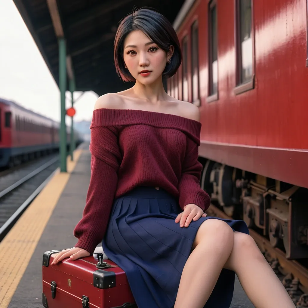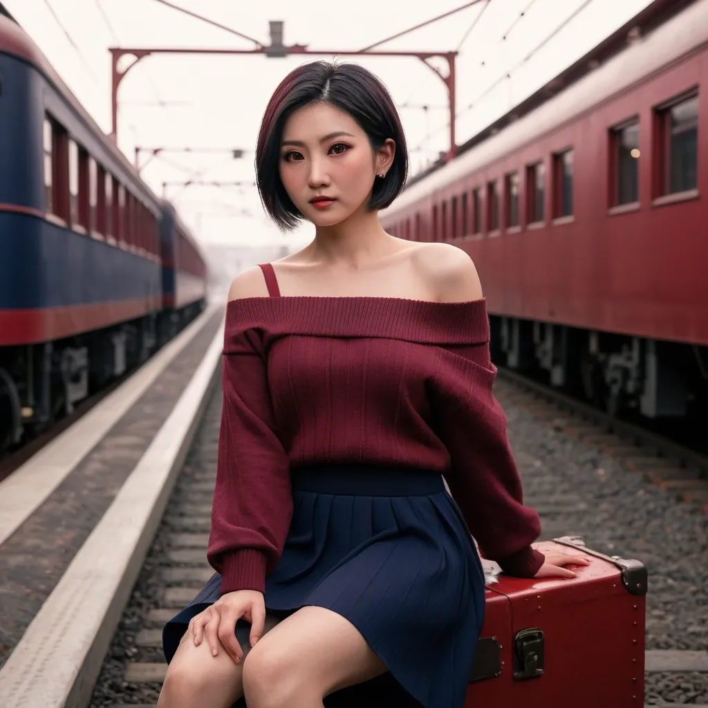 This is a highly realistic , almost photographic illustration. It beautifully captures the essence of an Asian woman's beauty , with vibrant colors , soft tones , and warm , gentle lighting. (Wine-red off-shoulder sweater: 1.3) , (Long navy blue skirt) , (Short hair parted in the middle: 1.3) , (Dark brown eyes: 1.3). The scene depicts her sitting on a suitcase at a raildroad station , an old steam locomotive black and red is approaching in background ,