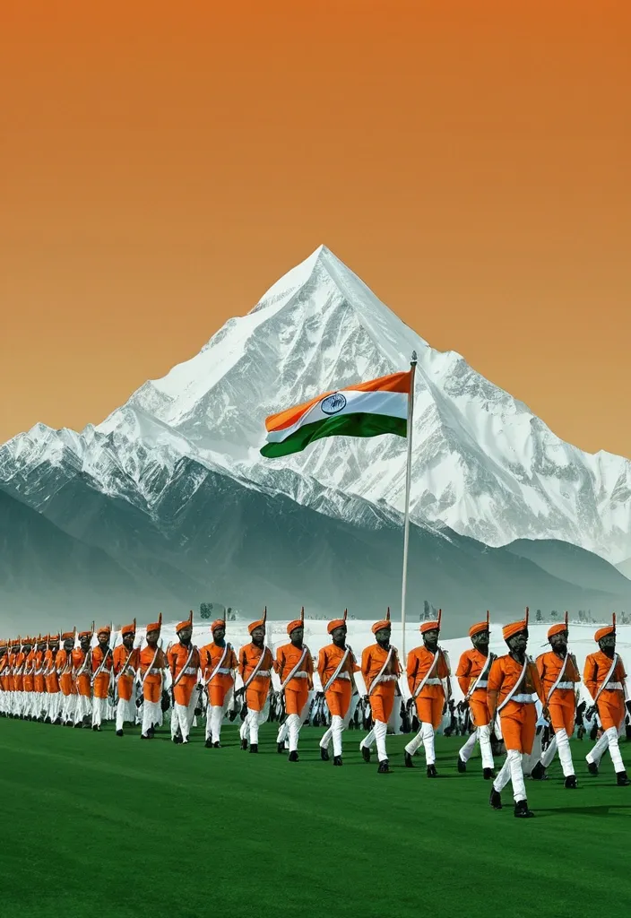 The top side of the screen is cloaked in Indian flag tricolor with text "Happy Republic Day" , a tricolor text "INDIA" with mountain background , stark-orange sky. A Indian military battalion marching in Parade to commemorate the anniversary of independence , with high caliber weapons , creating a seamless transition between the forming a striking three-tone contrast. The background is a giant fighter jet a thrilling airshow in deep sky , green grass surface below , creating a high-contrast , minimalist visual composition that feels both modern and surreal. The overall aesthetic is Parade-forward , bold , and conceptual , perfect for a high-impact album cover design. The simplicity of the elements ensures a timeless and iconic look , making the image feel both artistic and editorial. ,