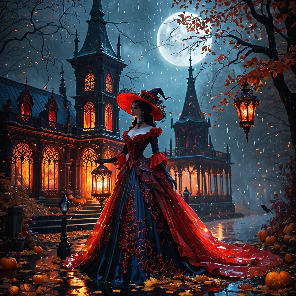 A captivating and dramatic digital painting featuring the silhouette of a witch in an elegant red and dark , ornate , lavish Victorian-style dress , her hat is very special standing with her s outstanding noble Witch's broom near to an elaborately decorated old Temple with floral decorations. The background is a striking contrast of dark blue and bright red , creating a mysterious and romantic mood. The woman , holding a noble lantern , is surrounded by large , vibrant halloween decorations , autumn leaves gently falling around her , emphasizing the elegance of the scene. Soft rays of light break through the darkness , illuminating the contours of her figure and highlighting the surrounding flowers. The overall composition is balanced , with the decorations forming a vibrant foreground against a more muted background. The artwork showcases an abstract style that blends impressionistic elements with bold colors , creating a sense of movement and emotion. The contrast of light adds depth , casts subtle shadows , and enhances the atmosphere of the work. This artwork is ideal for expressing themes of love and intrigue , conveying a sense of calm amidst the chaos of falling leaves , floating fog glowing from sunbeams in the rain and glows the dress of the beauty woman , candlelight giving a mystical scene , raindrops giving magical reflections and the Moon is shimmering a little through the rain ,