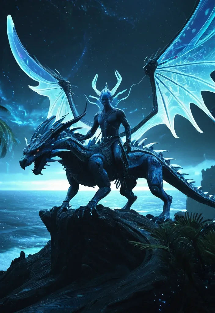A male Na'vi , the indigenous humanoid species of Pandora , perched confidently riding on the massive dragon , massive wings. Style: Celestial , Electronic circuit , ethereal , abstract , digital art Lighting: Dramatic backlighting , vortex glowing dusts , night-ocean background Composition: dynamic diagonal composition , sense of movement and wonder , magical atmosphere Quality: High detail , 4K , Masterpiece , Rendered in Octane ,