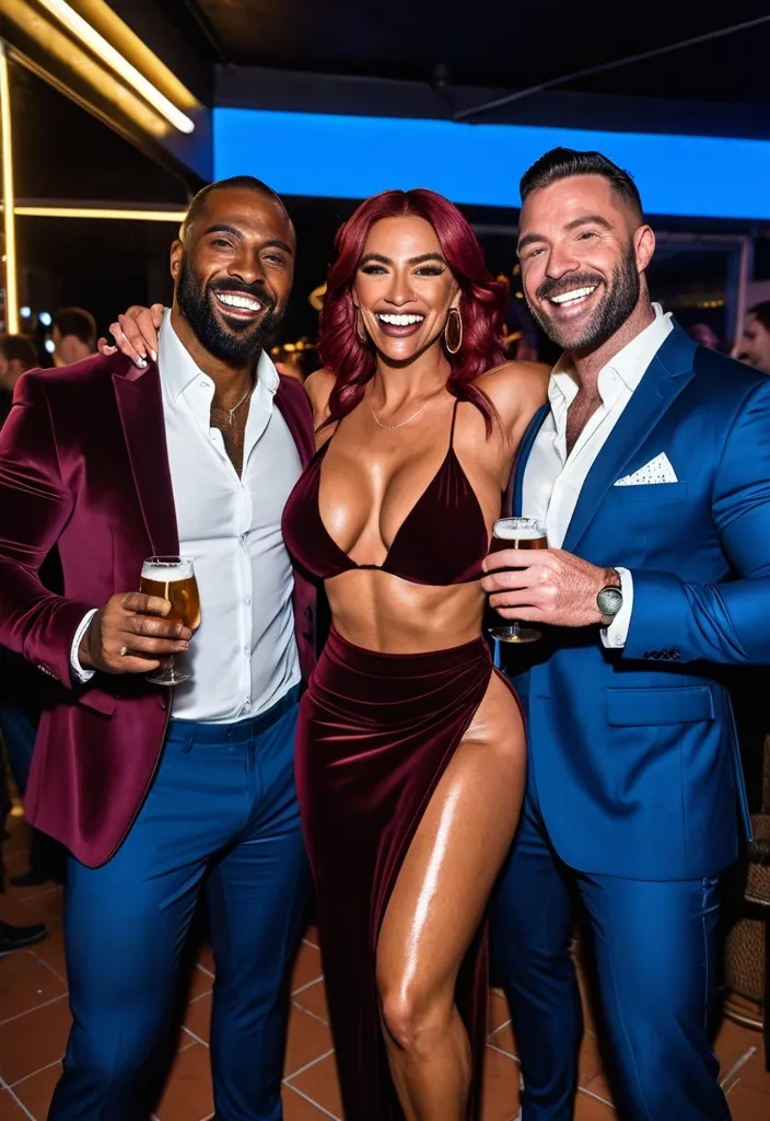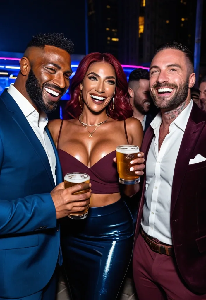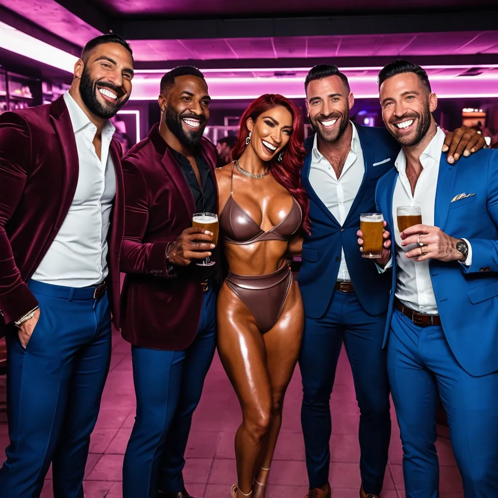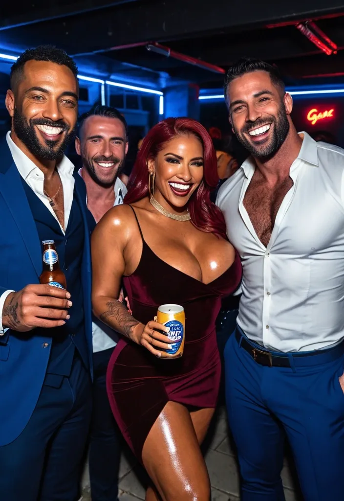 This is the same elite four-person team from the previous image , now off-duty and relaxed in a neon-drenched , cyberpunk-style nightspot called “Lost Rem.” The dramatic superhero armor has been traded for sharp , stylish civilian clothes , but their powerful physiques and natural charisma still make them stand out like gods among mortals. From left to right , the same lineup: 1. The African man (far left) The same towering , broad-shouldered Black man with deep brown skin and a short , well-groomed beard. He’s wearing a deep burgundy velvet blazer over a crisp white shirt , unbuttoned just enough to show a gold chain. He’s leaning forward with an easy , warm laugh , clearly the life of the table tonight. 2. The Latina woman (second from left) The same voluptuous , athletic woman with warm tan skin and long , thick red hair now styled in a single dramatic braid that falls over one shoulder. She’s in a fitted taupe ribbed top that hugs her curves , a delicate gold necklace resting in her cleavage. She’s flashing a bright , genuine smile while raising a bottle of “ZOOTS” beer in a cheerful toast , radiating relaxed confidence and playful energy. 3 & 4. The two Hispanic men (right side) Third from the left is the rugged , bearded one in a tailored midnight-blue suit , white shirt open at the collar , grinning wide with perfect teeth. On the far right is the younger , clean-shaven teammate in an almost identical dark blue suit , laughing with his eyes half-closed in genuine amusement. Both look effortlessly handsome and completely at ease. They’re clinking “ZOOTS” beer bottles over a small plate of fries , bathed in the electric blue-pink glow of the city night outside. The mood has completely flipped from the earlier intimidating strike-team portrait; here they’re just four close friends (or found family) letting loose after a mission , sharing inside jokes and unwinding together. The chemistry is obvious: they genuinely enjoy each other’s company , and even in civilian clothes they look like they could take over the world whenever they felt like it. ,