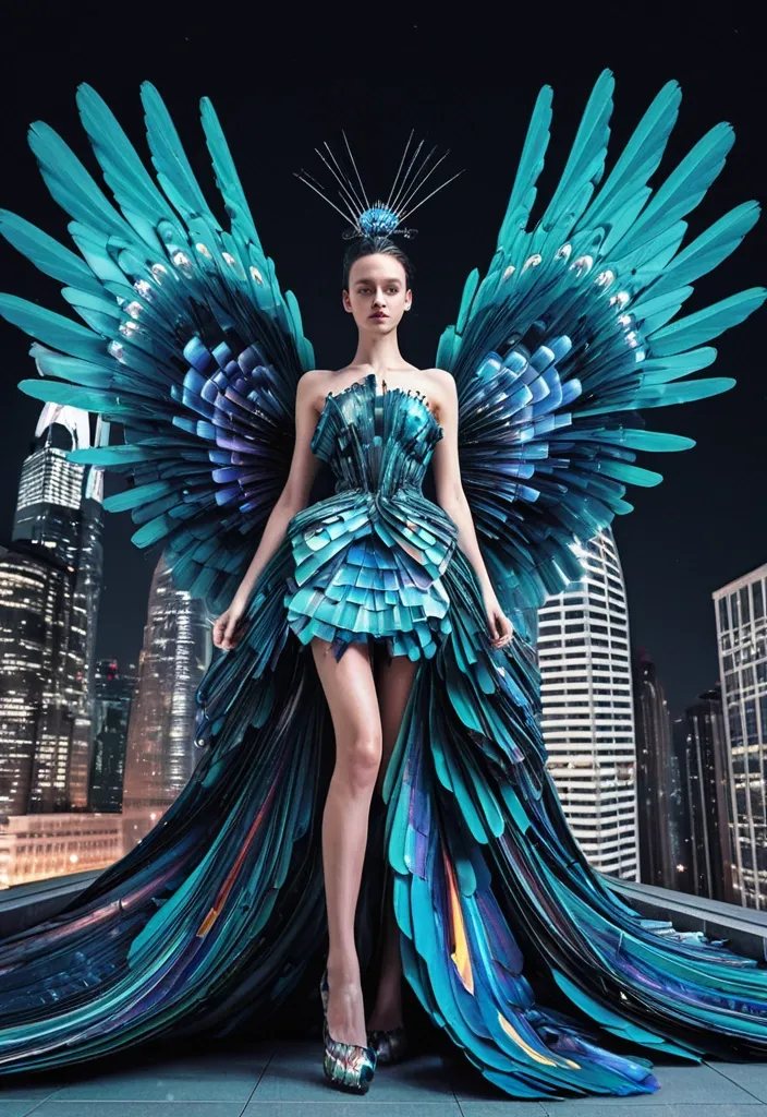 A Glitch-Art style , Fashion photograph of a Peacock-feathers like wings. Beauty and fashion supermodel , flying over endless night skyscraper , Organic Futurism skyscraper. The feathers pattern gown of the Bloom wings billows outward in all directions , unconventional , and fashionable clothing , as beautiful as heaven , trending on art-station. Full body shot from a eye Laval point. Head in the frame --ar 9:14 --raw. ,