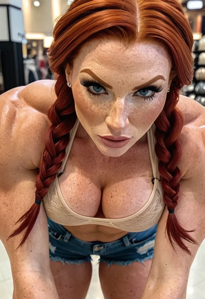 Generate Gorgeous female boss , bimbo , hourglass body , abnormally massive female bodybuilder , gorgeous , close up , full lips , big booty , redheaded , freckles on face and breast , braided design hair , feminine silhouette , too big breast , big booty , sexy thighs abs , silhouette , up close , flexing biceps , beautiful green eyes , legs are iconic and defining physical feature , both visually and in terms of combat ability.wearing an outfit that is a striking blend of elegance , power , and femininity , designed to command attention in any room. The suit is tailored to perfection , hugging the wearer’s curves with precision while emphasizing a structured silhouette. The fabric itself is a refined grey tweed patterned with subtle white grid lines , giving the suit a texture that feels both sophisticated and modern. The blazer features broad blue lapels and gold button accents , adding a luxurious touch that elevates the look beyond typical business attire. The matching high-waisted trousers elongate the frame , further enhancing the poised and commanding effect of the ensemble.The styling choices amplify the boldness of the suit. The inner blouse is a silky , greybutton-down shirt that complements the tweed’s tone while introducing a softer , feminine balance to the sharp tailoring of the jacket. The blouse peeks out neatly from under the blazer , maintaining elegance without drawing focus away from the suit’s commanding cut. Accessories are kept minimal yet intentional: a delicate layered gold necklace and hoop earrings that add glimmers of light and luxury without overpowering the outfit. The choice of voluminous , honey-brown braids cascading down her shoulders frames the face with both confidence and glamour , completing the commanding visual.Altogether , this look communicates a blend of authority and allure. It is business-ready yet fashion-forward , balancing corporate structure with vibrant femininity. The color palette blue , grey and gold avoids being overly delicate , instead embracing the richness of texture , structure , and presence. This is the kind of ensemble that speaks to ambition , sophistication , and personal style—ideal for someone who thrives in positions of influence but insists on expressing her individuality with bold elegance. It’s not just clothing—it’s a statement of power wrapped in grace. In luxury living legs that could crush a watermelon , skirt high boots are a bold and striking statement piece , crafted in glossy black patent leather that gives them a sleek , polished finish. Rising to just below the knee , the boots feature three adjustable buckle straps along the shaft , adding both edge and detail to their design. The towering stiletto heel , paired with a thick platform sole , creates an ultra-dramatic silhouette that elongates the leg and exudes power and confidence. With their combination of shine , height , and structure , these boots perfectly balance fierce femininity with high-fashion allure , beige and brown accented t-tank top and blue jean shorts in mall , freckles , ginger hair , leaning forward toward the viewer in a teasing , flirtatious pose , clinging to her exaggerated bust and becoming semi-transparent , revealing the outline of her bra. She clasps her hands together in front and her arms pushing her chest out while gazing downward with a shy yet playful expression , ,