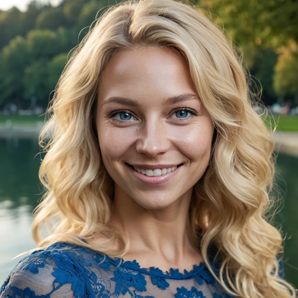 Ultra-high-definition photorealistic close-up portrait of a 42-year-old blonde woman with long , wavy hair , wearing a blue lace dress and smiling confidently at the camera. Her skin is radiant and natural with a warm , approachable expression. The background depicts a soft , blurred park with trees and a lake. The lighting is bright and even , emphasizing her features and the friendly tone of the image. ,
