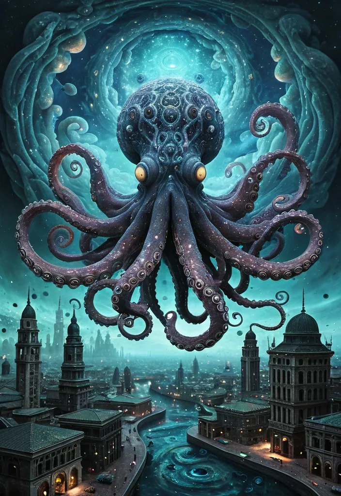 A colossal , ancient octopus breaching from a sea of swirling nebulae , its body encrusted with miniature , Surreal Miniature Cityscapes. The cities have bioluminescent flora and strange , geometric architecture. The octopus's eye reflects a distant galaxy. Style: Cosmic surrealism , digital painting with cinematic lighting , reminiscent of H.R. Giger and Zdzisław Beksiński. ,