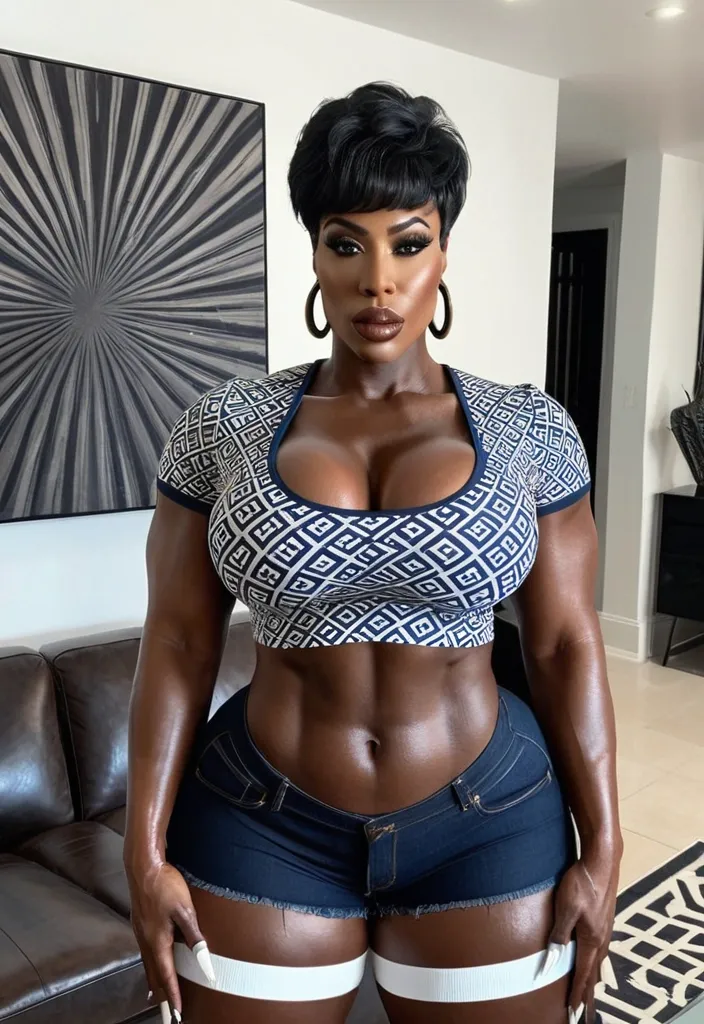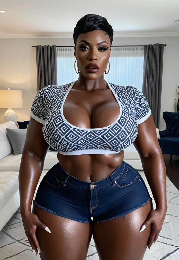 Generate Gorgeous female boss , bimbo , very dark-skinned African-American woman , short , pixie hair , hourglass body , abnormally massive female bodybuilder , gorgeous , close up , full lips , big booty , dark brown eyes , very big plump lips , feminine silhouette , too big breast , big booty , sexy thighs abs , silhouette , up close , flexing biceps , big gorgeous light brown eyes , legs are iconic and defining physical feature , both visually and in terms of combat ability.wearing an outfit that is a striking blend of elegance , power , and femininity , designed to command attention in any room. The suit is tailored to perfection , hugging the wearer’s curves with precision while emphasizing a structured silhouette. The fabric itself is a refined grey tweed patterned with subtle white grid lines , giving the suit a texture that feels both sophisticated and modern. The blazer features broad blue lapels and gold button accents , adding a luxurious touch that elevates the look beyond typical business attire. The matching high-waisted trousers elongate the frame , further enhancing the poised and commanding effect of the ensemble.The styling choices amplify the boldness of the suit. The inner blouse is a silky , greybutton-down shirt that complements the tweed’s tone while introducing a softer , feminine balance to the sharp tailoring of the jacket. The blouse peeks out neatly from under the blazer , maintaining elegance without drawing focus away from the suit’s commanding cut. Accessories are kept minimal yet intentional: a delicate layered gold necklace and hoop earrings that add glimmers of light and luxury without overpowering the outfit. The choice of voluminous , honey-brown braids cascading down her shoulders frames the face with both confidence and glamour , completing the commanding visual.Altogether , this look communicates a blend of authority and allure. It is business-ready yet fashion-forward , balancing corporate structure with vibrant femininity. The color palette blue , grey and gold avoids being overly delicate , instead embracing the richness of texture , structure , and presence. This is the kind of ensemble that speaks to ambition , sophistication , and personal style—ideal for someone who thrives in positions of influence but insists on expressing her individuality with bold elegance. It’s not just clothing—it’s a statement of power wrapped in grace. In luxury living legs that could crush a watermelon , skirt high boots are a bold and striking statement piece , crafted in glossy black patent leather that gives them a sleek , polished finish. Rising to just below the knee , the boots feature three adjustable buckle straps along the shaft , adding both edge and detail to their design. The towering stiletto heel , paired with a thick platform sole , creates an ultra-dramatic silhouette that elongates the leg and exudes power and confidence. With their combination of shine , height , and structure , these boots perfectly balance fierce femininity with high-fashion allure. Massive breast , massive cleavage , driving and standing in living room , wearing a white , dark navy blue and black accented subtle symmetrical patterned t-shirt , black denim shorts , enormous butt ,
